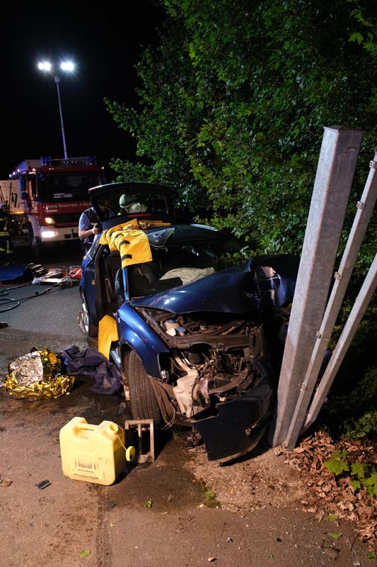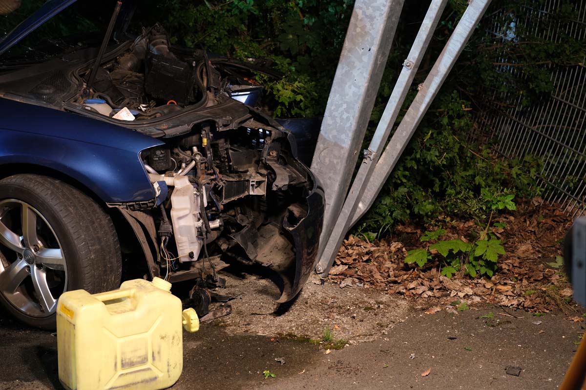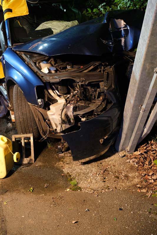 Zu dem Unfall war es gegen 23:25 Uhr gekommen. Der Fahrer des älteren A3 fuhr mutmaßlich mit überhöhter Geschwindigkeit auf der Friedrich-Kramer-Straße in Richtung der Firma Wiederhold. In der scharfen Rechtskurve am Ende der Steigungsstrecke verlor er die Kontrolle über das Auto, geriet nach links von der Fahrbahn ab und prallte gegen den massiven Mast einer Einfahrt. Durch den heftigen Aufprall wurde der Pkw abrupt gestoppt und im Bereich der Front erheblich beschädigt.