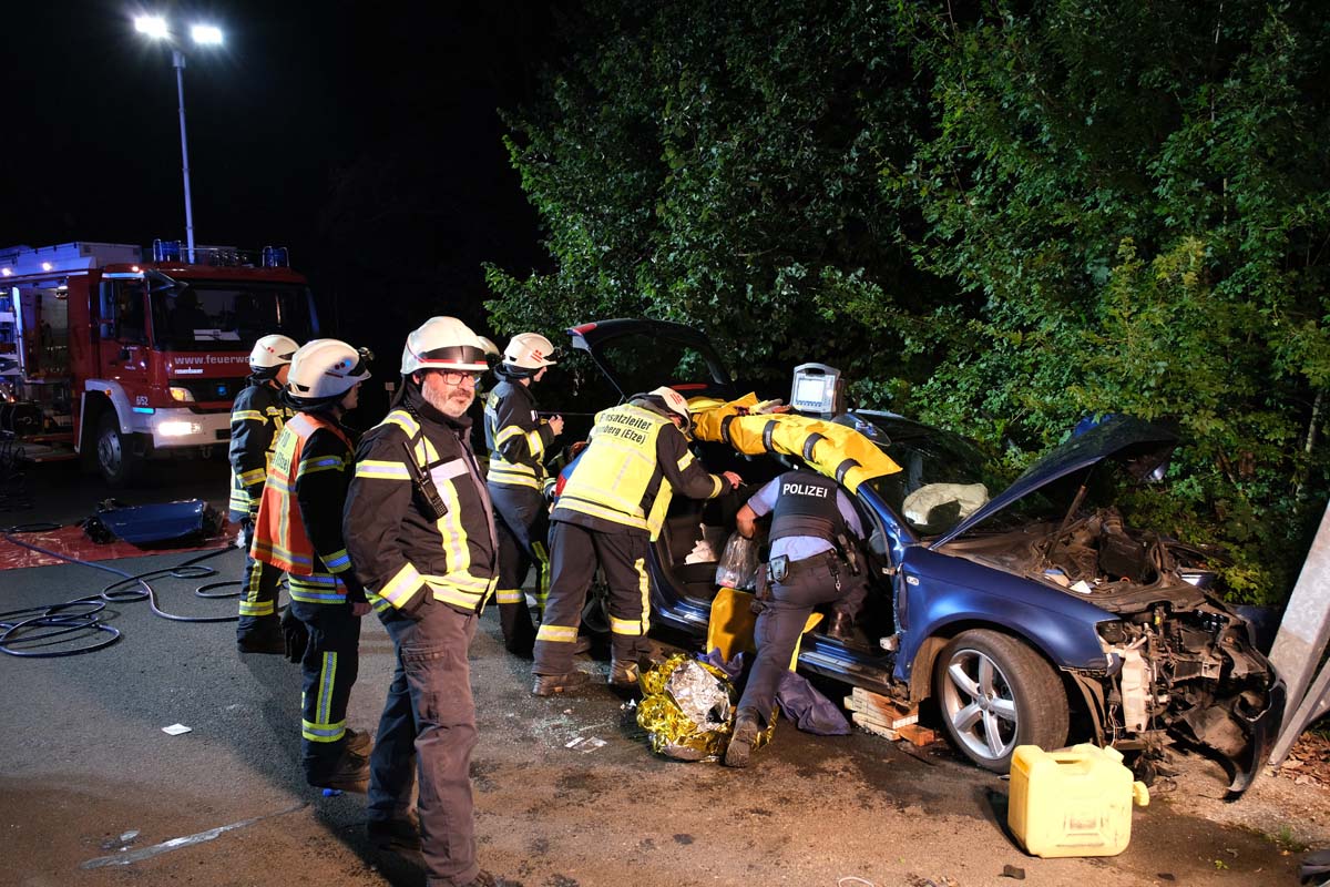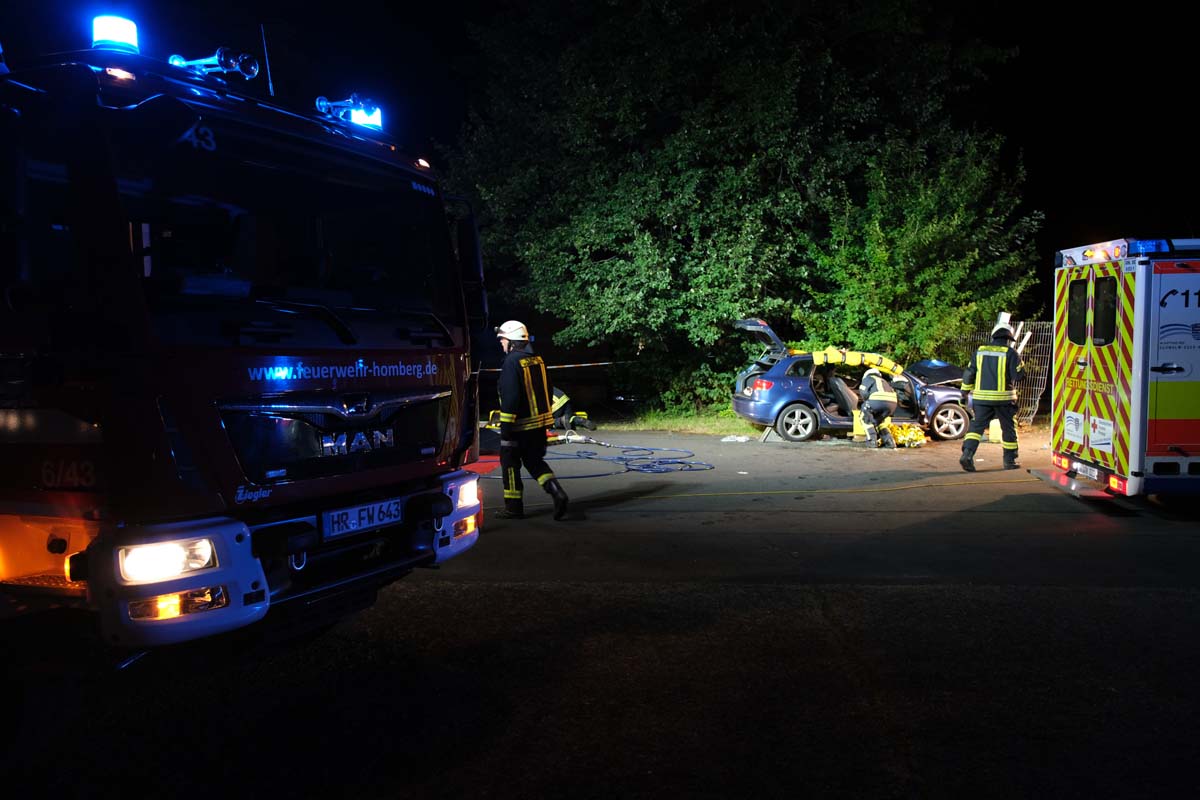 HOMBERG (EFZE). Im Homberger Behördenzentrum, der ehemaligen Dörnberg-Kaserne, sind am späten Montagabend bei einem Alleinunfall zwei junge Männer schwer verletzt worden. Während der Fahrer (19) des Audi das Unfallwrack ohne Hilfe der Feuerwehr verlassen konnte, mussten der Beifahrer (21) mithilfe von technischem Gerät befreit werden.