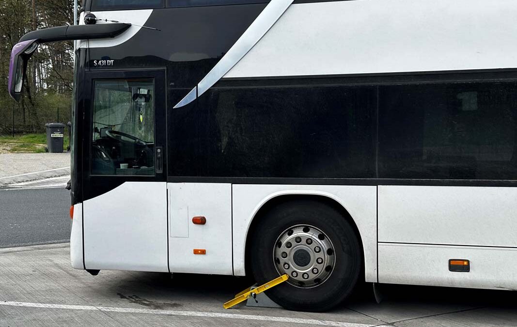 Ein weiterer Vorfall von besonderer Bedeutung war ein mit 20 Fahrgästen besetzter Reisebus aus Rumänien. Der Bus, der auch einen Anhänger führte, war wiederholt zu schnell unterwegs und überschritt das Tempolimit von 80 km/h mit einer Geschwindigkeit von 100 km/h. Bei der anschließenden technischen Überprüfung stießen die Beamten auf mehrere gravierende Mängel: eine über den Rand hinaus gerissene Bremsscheibe, einen horizontalen Riss in der Windschutzscheibe direkt im Sichtfeld des Fahrers und ein defektes Luftfahrwerk, welches den Bus ständig auf- und abpumpen ließ. Zudem waren an dem mitgeführten Anhänger beidseitig Reparatur-Schweißnähte im Bereich der Achsen gerissen. Aufgrund dieser Mängel wurde die Weiterfahrt des Busses mit Fahrgästen untersagt, bis eine geeignete Werkstatt für die notwendigen Reparaturen gefunden ist. Um die Weiterfahrt des Busses zu unterbinden, setzten die Beamten eine Parkkralle ein. Die Fahrgäste wurden für die weitere Reise mit Kleinbussen befördert. Darüber hinaus kam heraus, dass die Fahrer des Busses das Kontrollgerät nicht korrekt bedient hatten, was den Verdacht nahelegt, dass nicht alle Fahrzeiten ordnungsgemäß erfasst wurden. Gegen die zwei Fahrer, im Alter von 32 und 33 Jahren, wurden Ordnungswidrigkeitenverfahren eingeleitet und zur Sicherung der Verfahren Sicherheitsleistungen in Höhe von insgesamt 1.190 Euro erhoben. (wal)