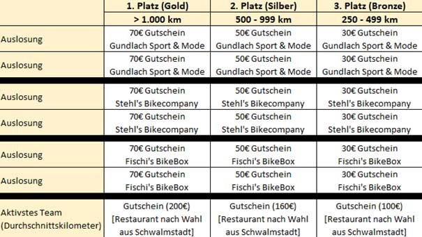 Für die Teilnehmenden gibt es erneut Preise, die von der Stadt Schwalmstadt sowie den lokalen Unterstützern Stehl’s Bikecompany, Fischi’s Bike Box und Gundlach Sport & Mode zur Verfügung gestellt werden. Die Verlosung erfolgt in verschiedenen Kilometerkategorien. (wal)