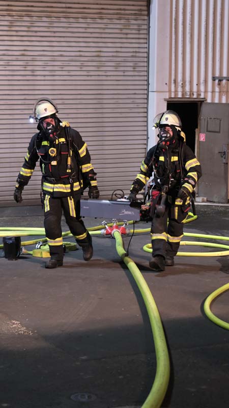 Drei fiktive Brandherde innerhalb der Halle sorgten für eine intensive Rauchentwicklung, die die Bedingungen eines echten Einsatzes nachahmte. Um den wöchentlichen Übungsdienst auszuweiten, holte sich Bräutigam Unterstützung von den Kameraden aus Fritzlar-Geismar, die in ihrer Heimatstadt Teil des Katastrophenschutzzuges sind.