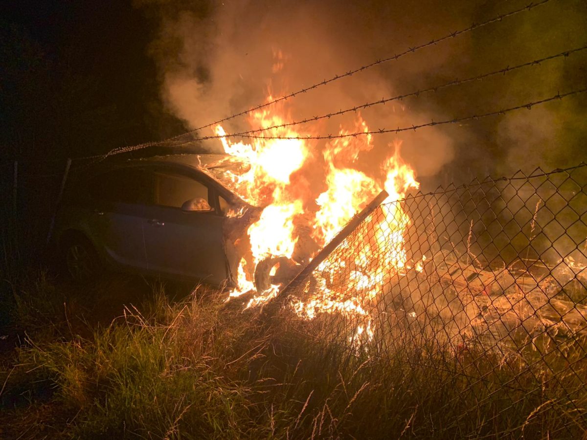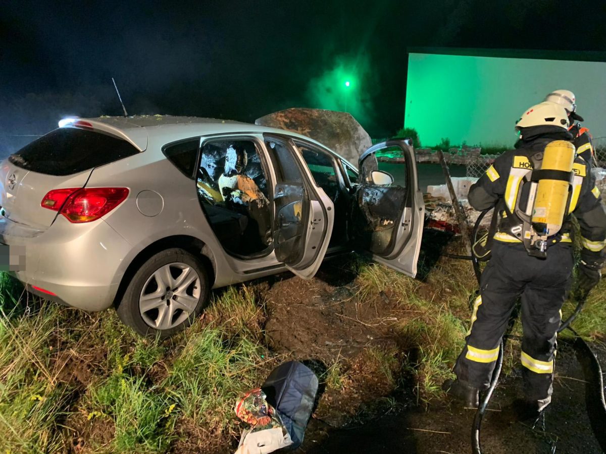 Beim Ausweichen des Tieres verlor der 18-Jährige die Kontrolle über das Fahrzeug. Er geriet von der Fahrbahn ab und durchbrach den Zaun einer Firma. Aus dem Fahrzeug konnte sich der junge Mann noch selbstständig retten. Wenige Augenblicke später schlugen Flammen aus dem Motorraum des Opels.