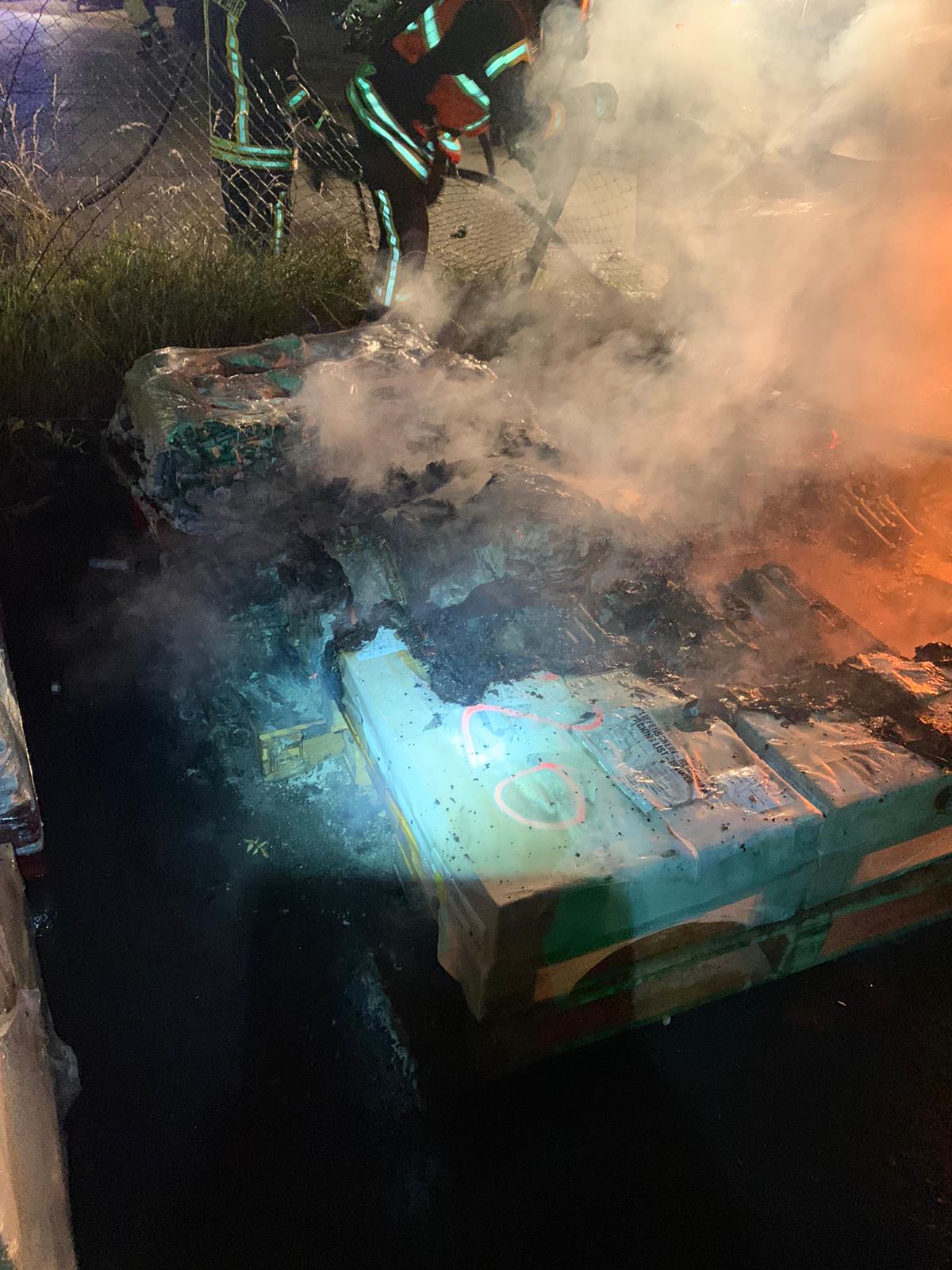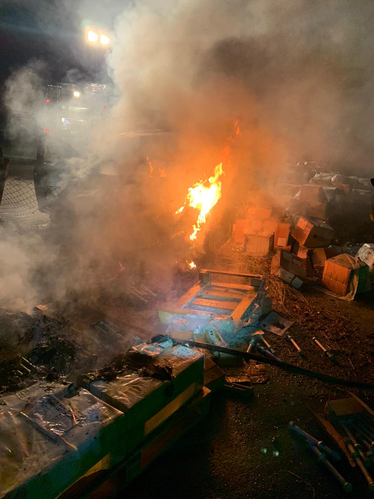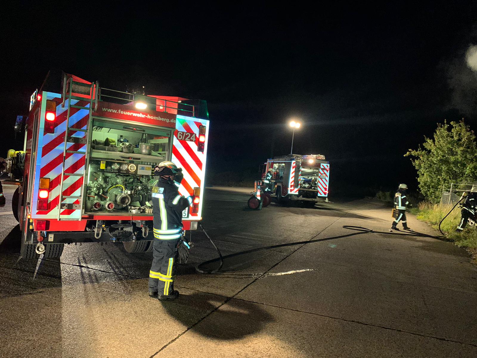 Ein Atemschutztrupp der Homberger Feuerwehr unter der Leitung von Wehrführer Matthias Poppitz löschte den Wagen und die angrenze Umgebung, darunter auch gelagerte Waren und Paletten der Firma. (wal)