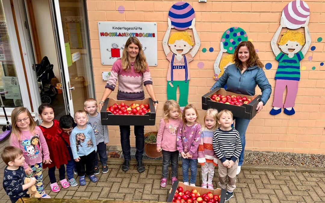Strahlende Kinderaugen bei der Übergabe: Christina Hainmüller (rechts im Bild) übergibt die Äpfelkisten an Carolin Stehlik, Leiterin der KITA Hochlandstrolche in Gilserberg (links im Bild)