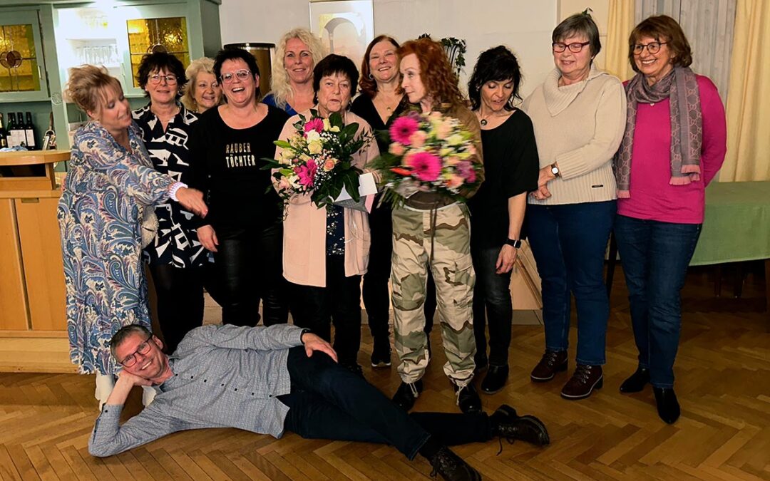 Gruppenbild der Gymnastikdamen mit liegendem Vorsitzenden Jürgen Berger und den ausgeschiedenen Vorstandsmitgliedern Anneliese Baum und Irmhild Wickert mit Blumen von links: Anja Dickel, Birgit Hahn, Tanja Schmidt, Kerstin Dreyer, Ramona Diehl, Anneliese Baum, Irena Baum, Irmhild Wickert, Carmen Schmerer, Karin Briel, Maritta Petersen (wal)