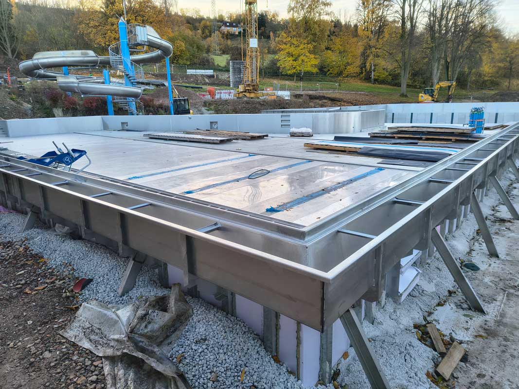 Die Firma Berndorf wird in Kürze den Bodenbereich des Edelstahlbeckens fertigstellen. Parallel schreiten die Arbeiten an der Badewassertechnik mit der Installation der Leitungen rund um das Becken zügig voran.