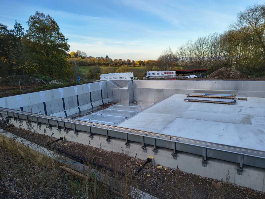 Die Firma Gluck hat den Boden des Schwimmbeckens betoniert. Die Anlagenbau für Wassertechnologie GmbH & Co. KG (AfW) schloss die Reinwasserleitung im Zwischenraum zwischen alter und neuer Beckenwand an. Durch die Herbstregen wird die Sprunggrube im tiefen Teil des Beckens bis auf 1,50 Meter aufgefüllt, um sie gegen Auftrieb zu sichern. Dieser Teil des Beckens ist bereits vollständig ausgekleidet.