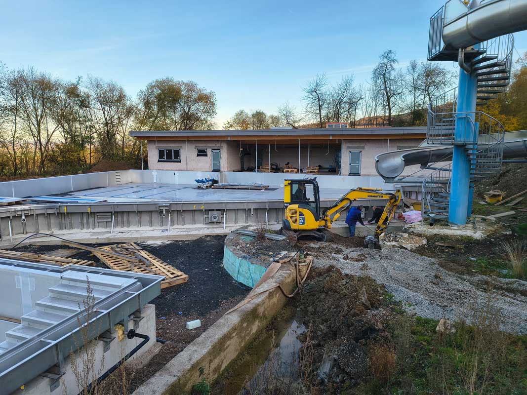Auch die Gestaltung der Außenanlagen ist ausgeschrieben. Dazu gehören der Beckenumgang und die Flächen des dritten Bauabschnitts. Nach der Vergabe der Arbeiten kann der nächste Bauabschnitt beginnen.