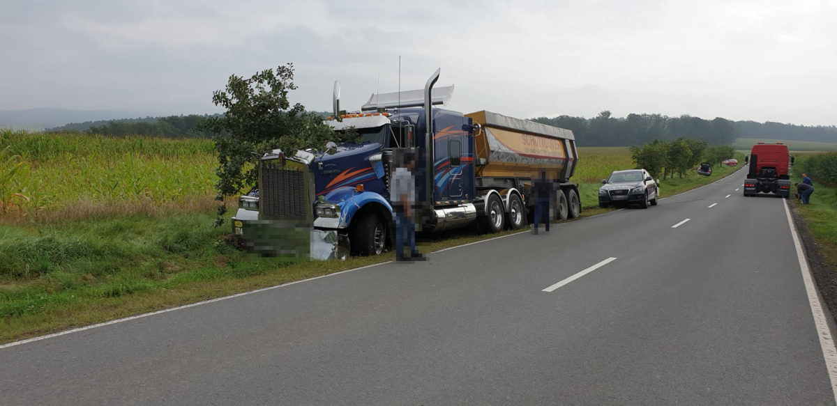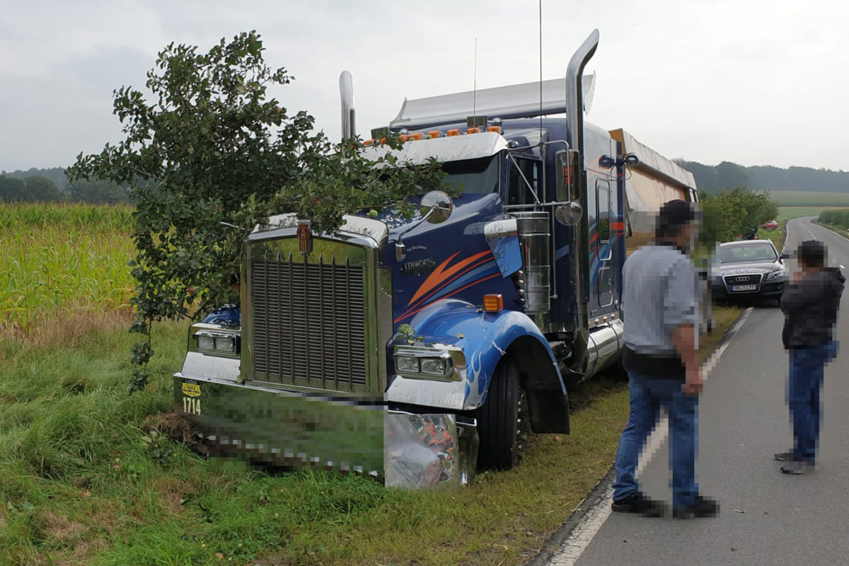 Auch der Sattelzug, bestehend aus einer Zugmaschine, einem amerikanischen Truck, und einem leeren Sattelauflieger, kam von der Straße ab und erst im Graben zum Stehen. Der Fahrer blieb unverletzt.