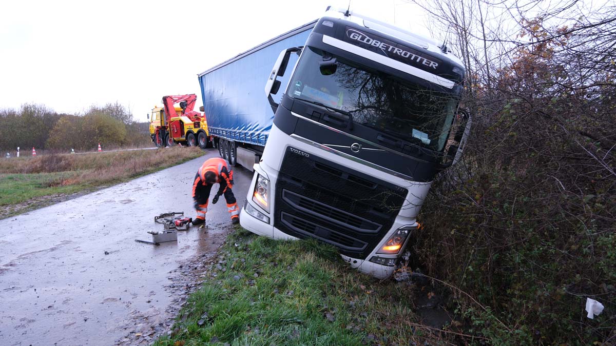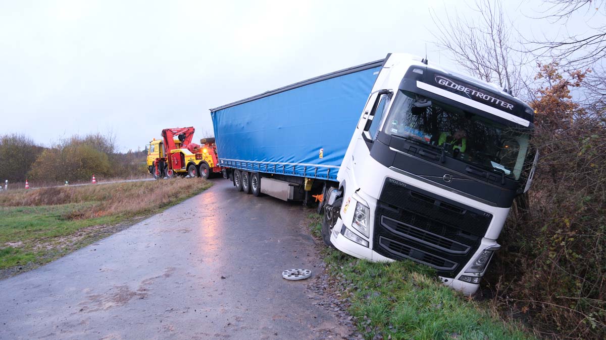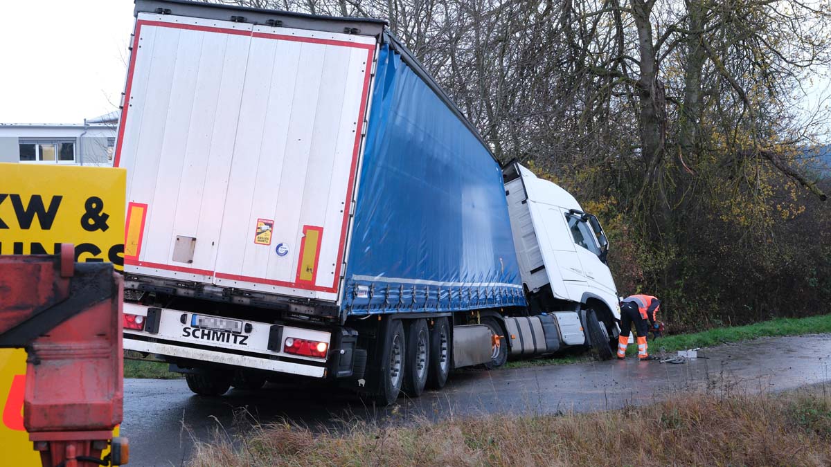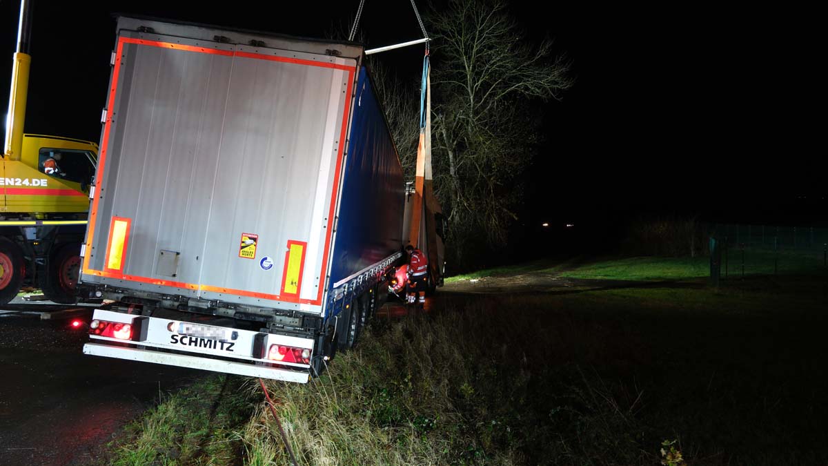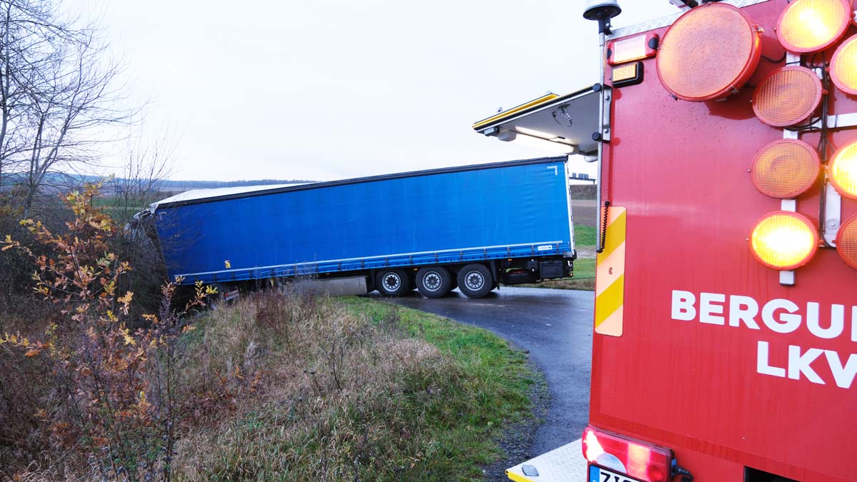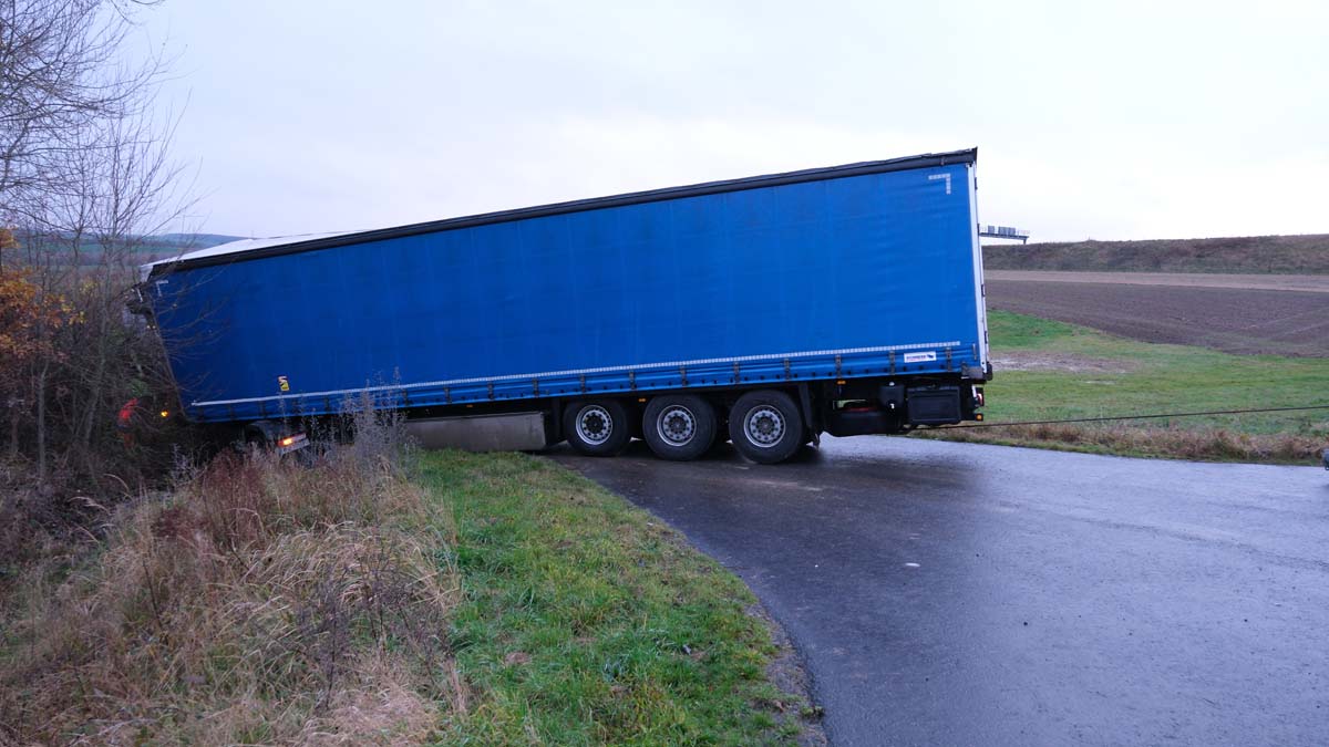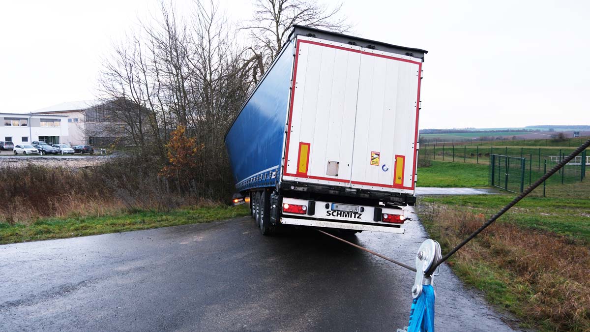 Die Kreisstraße war während der Bergung einspurig befahrbar. Der junge Fahrer des Sattelzugs blieb unverletzt. (wal)