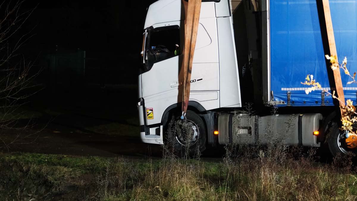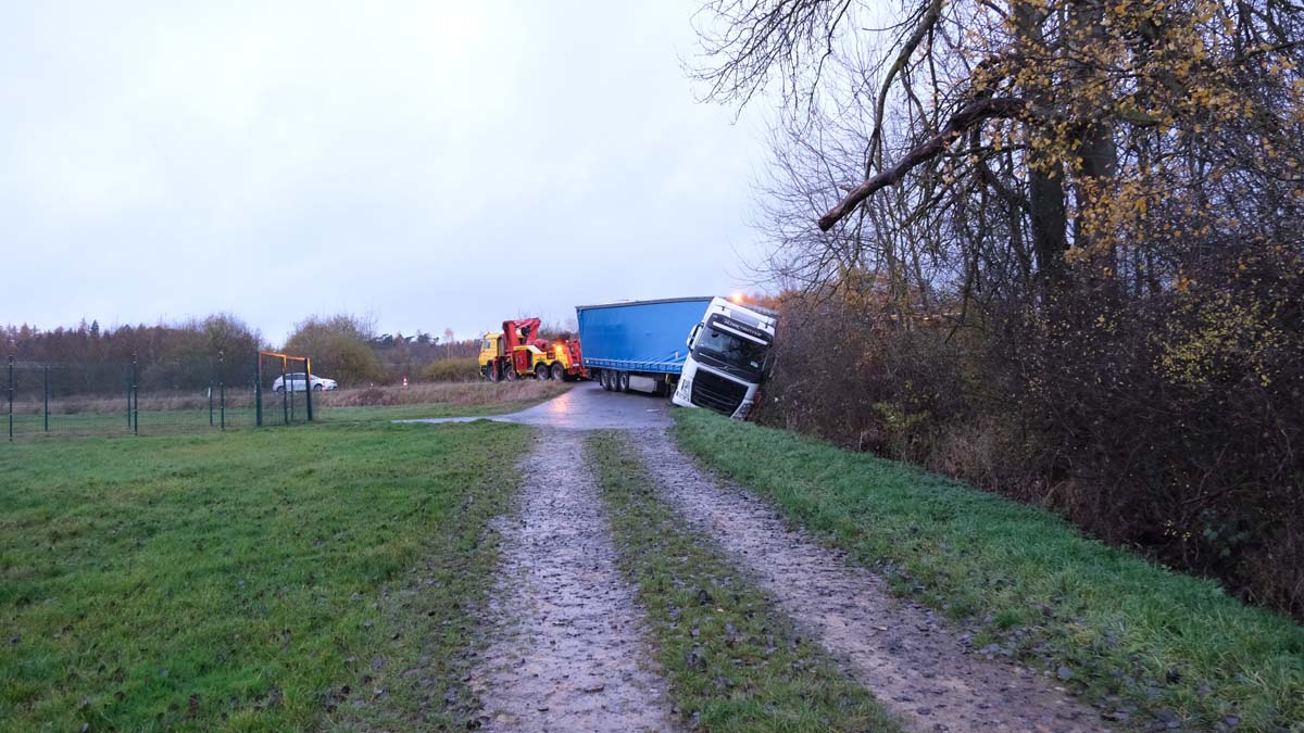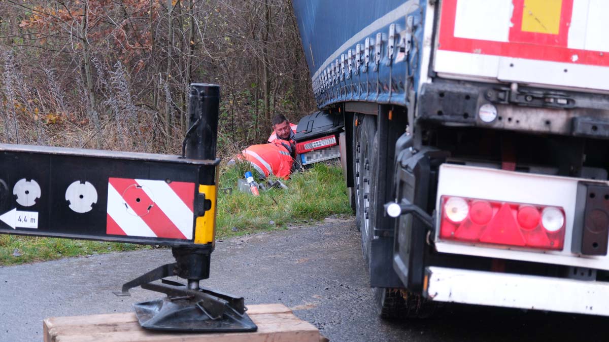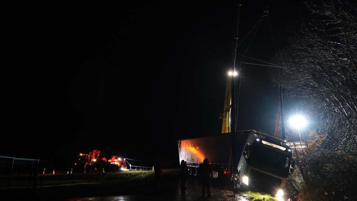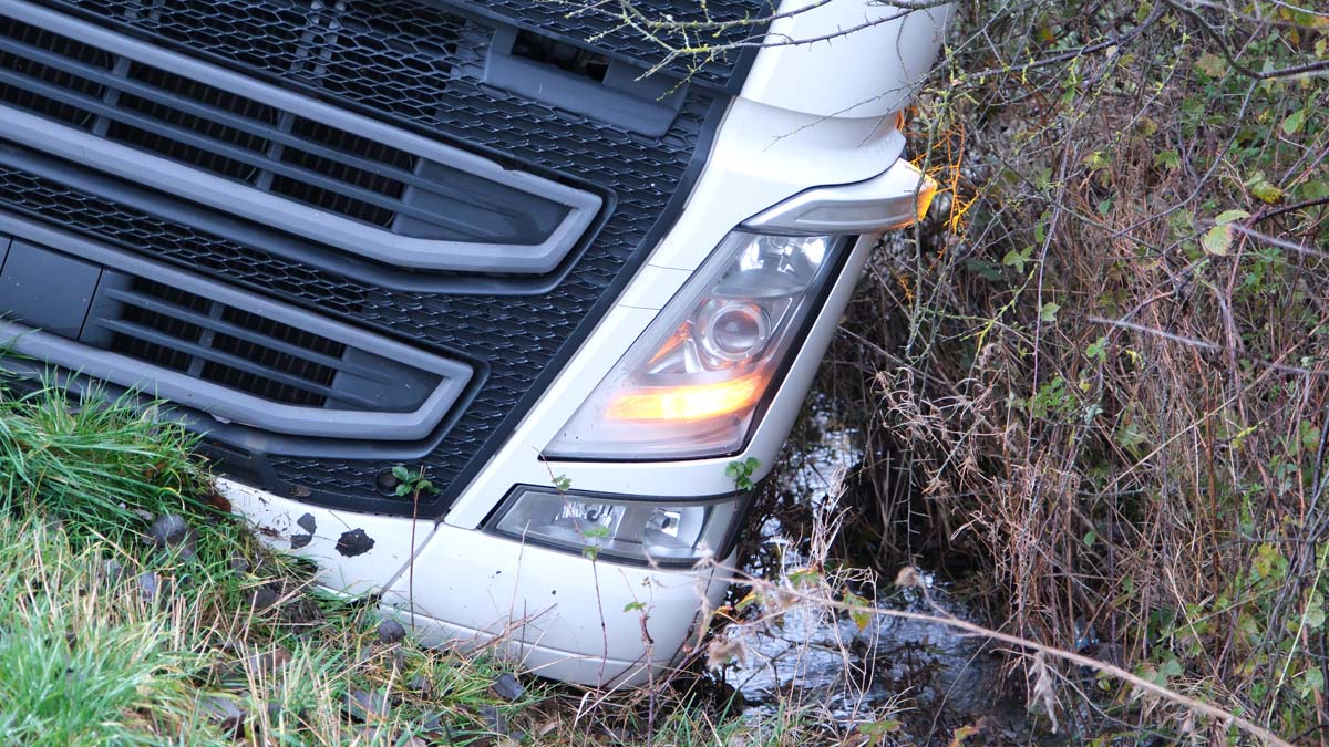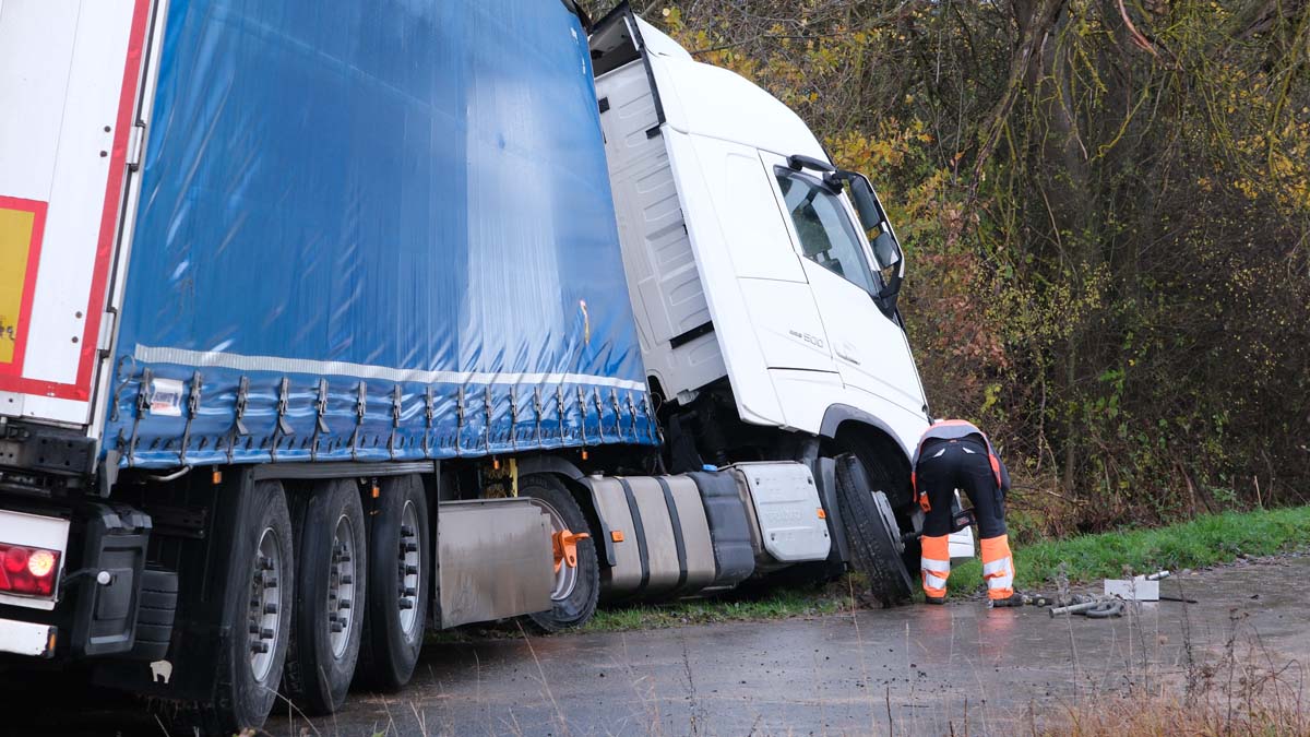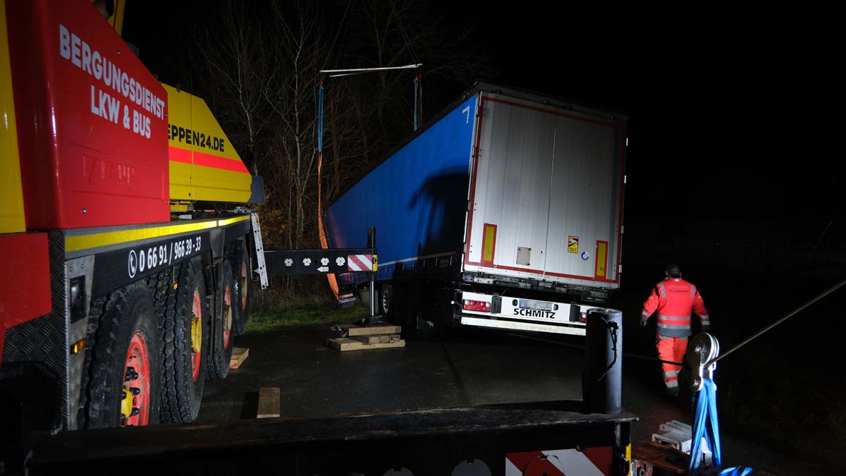 Die Kreisstraße war während der Bergung einspurig befahrbar. Der junge Fahrer des Sattelzugs blieb unverletzt. (wal)
