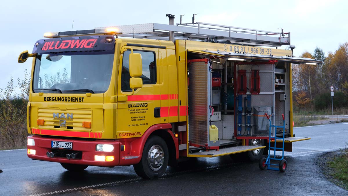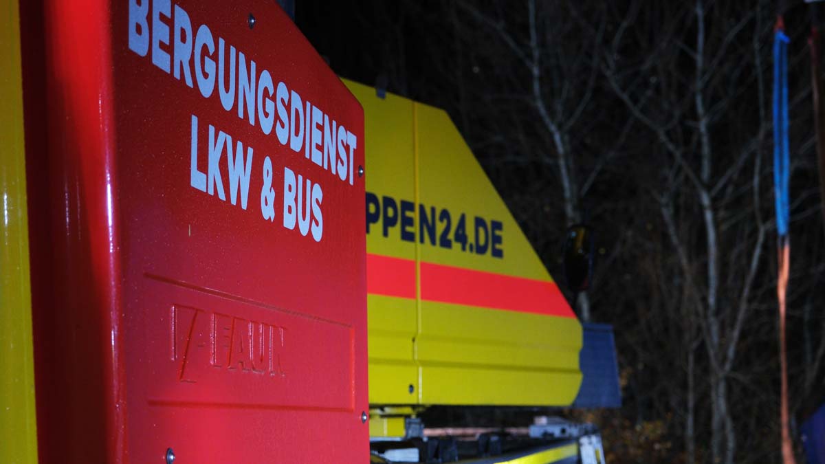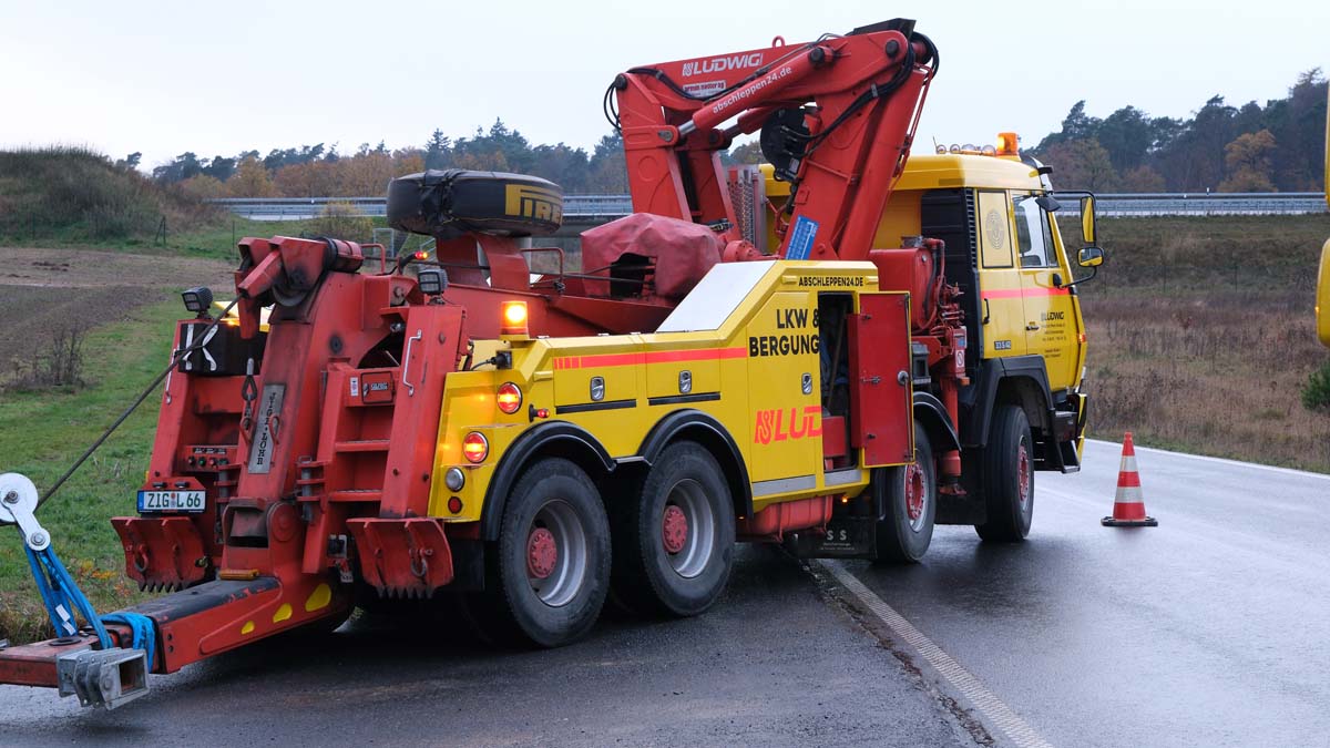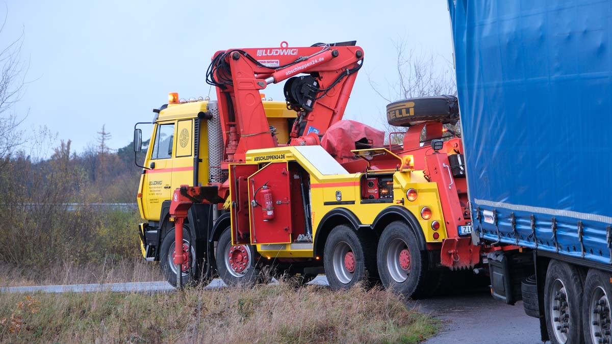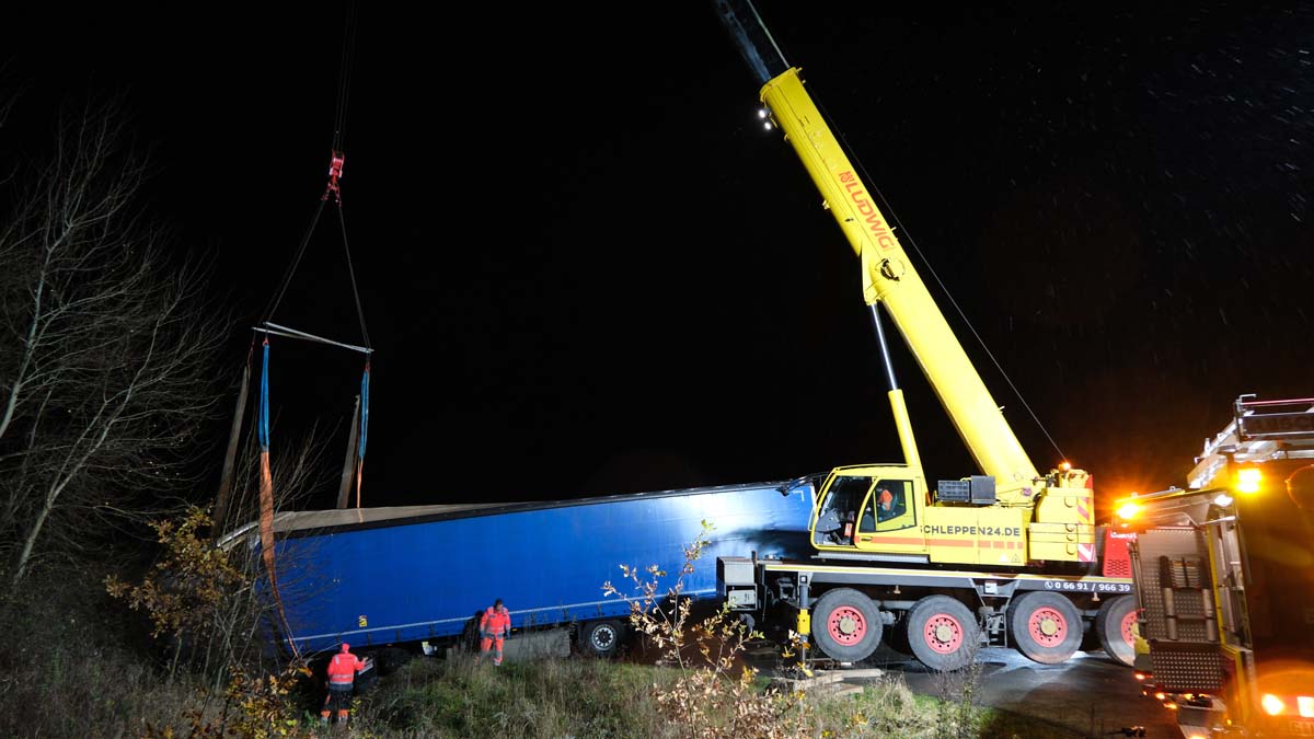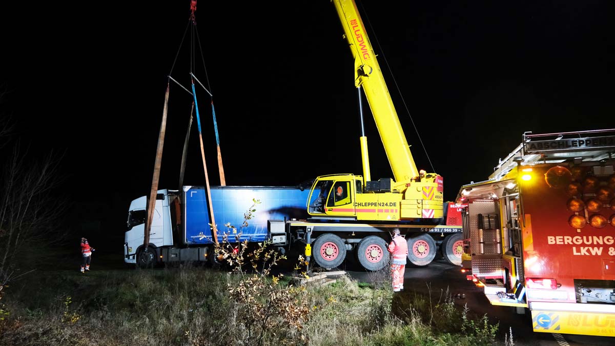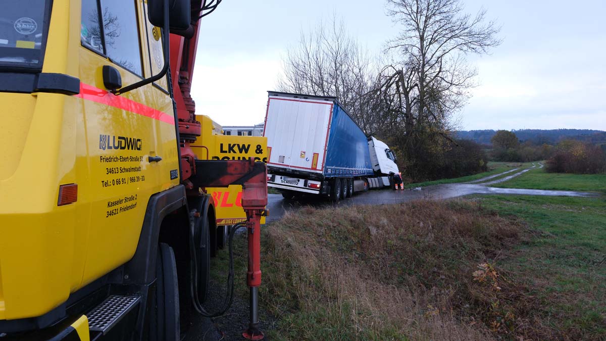 Das Bergeunternehmen Ludwig aus Treysa rückte unter anderem mit einem Autokran einem Berge-Lkw und vier Mitarbeitern an, um das Fahrzeug, dessen Auflieger leere Paletten geladen hatte, aus dem Flutgraben zu ziehen.