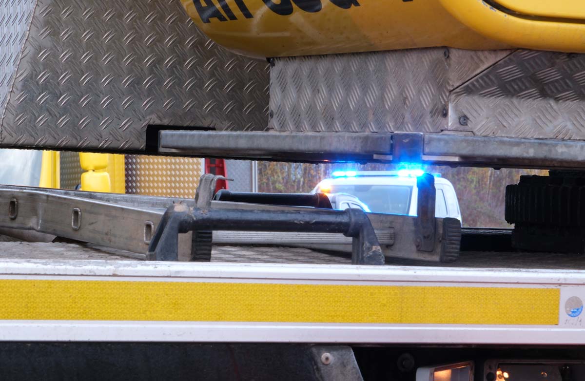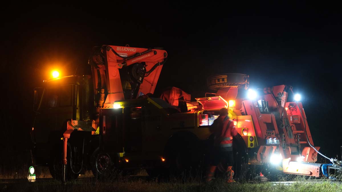 Dazu wurde der Sattelzug zunächst mithilfe des Berge-Lkw und dessen Seilwinden gesichert und die Zugmaschine mit dem Autokran angehoben. Anschließen wurden die teilweise schwebende Zugmaschine und der Auflieger mit den Seilwinden aus dem Flutgraben gezogen. Gegen 18:40 Uhr war der Lkw geborgen.