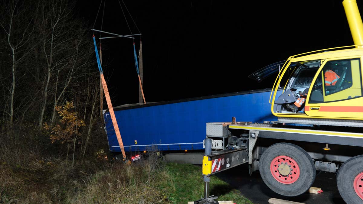 In der Folge geriet die Zugmaschine auf den unbefestigten Seitenstreifen und rutschte an diesem hinab, was den Auflieger mit sich zog.