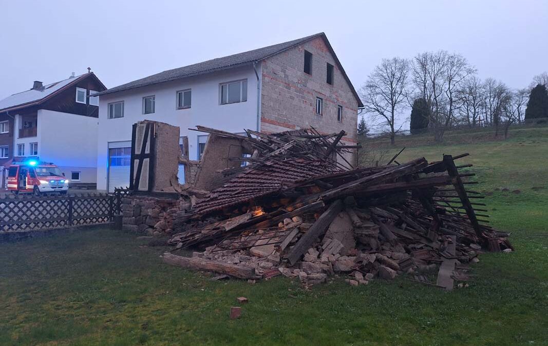 KNÜLLWALD. Direkt neben dem Feuerwehrgerätehaus in der Pommerstraße in Knüllwald-Ellingshausen stürzte am Ostermontagmorgen einer kleinen Scheune ein. Aufgrund der Ungewissheit über mögliche Personen im Gebäude zum Zeitpunkt des Vorfalls alarmierte der Disponent der Rettungsleitstelle umgehend zahlreiche Einsatzkräfte zur Unglücksstelle.