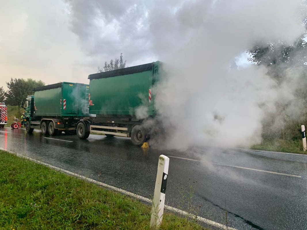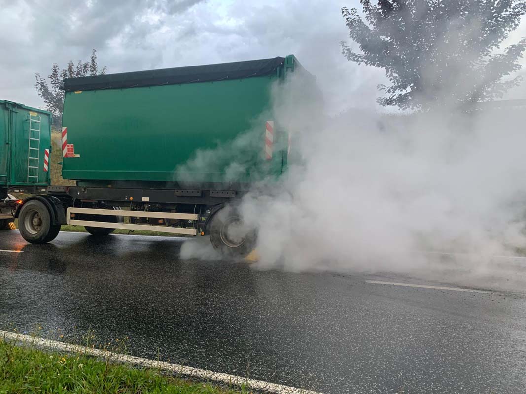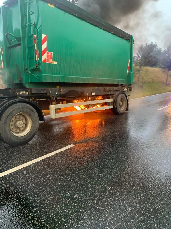 HOMBERG (EFZE). Auf der Homberger Nordumgehung (Landesstraße zwischen der Kreuzung am Hagebaumarkt und dem Abzweig nach Melsungen) brannte am Mittwochmorgen der hintere rechte Reifen des Anhängers eines mit Holzhackschnitzeln beladenen Gliederzuges.