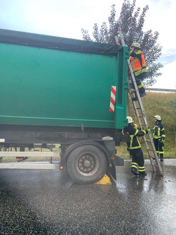 Wie Einsatzleiter und Hombergs Wehrführer Matthias Poppitz berichtete, wurde die Feuerwehr kurz vor 7 Uhr alarmiert. Als Poppitz und seine Kameraden kurz nach der Alarmierung an der Brandstelle eintrafen, stand das hintere rechte Rad des Anhängers bereits in Vollbrand. Aufgrund der leicht entzündlichen Ladung aus Hackschnitzeln entschied sich Poppitz für eine Brandbekämpfung mit zwei Trupps unter Atemschutz. Durch den massiven Löschangriff konnten die Flammen schnell gelöscht werden. Bei der Nachkontrolle, bei der auch eine Wärmebildkamera zum Einsatz kam und Feuerwehrleute die Ladung über eine Leiter auch optisch in Augenschein nahmen, ergaben sich keine Hinweise auf mögliche Glutnester. Die Ladung konnte im Auflieger verbleiben.