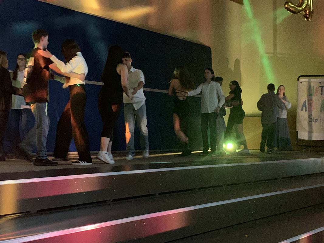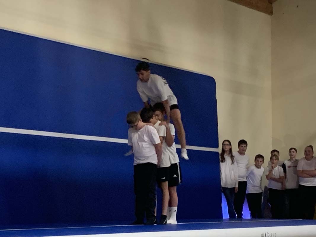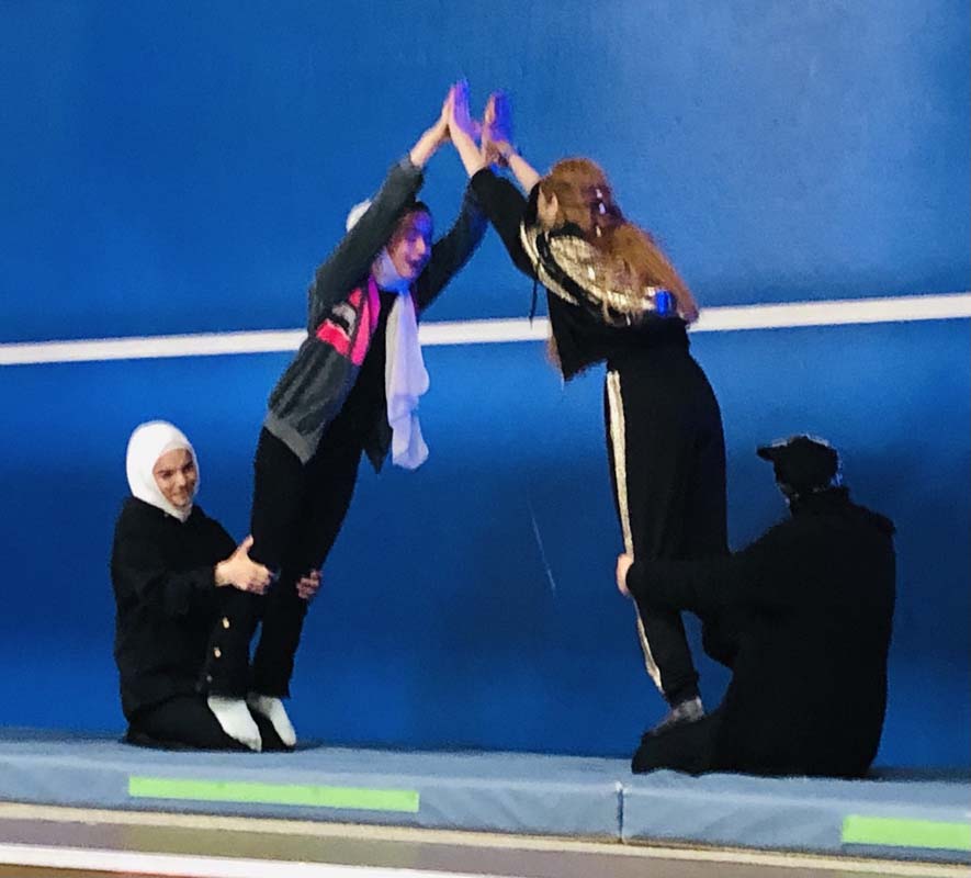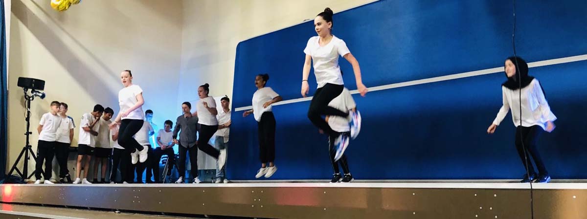 Der sportliche Teil des Abends wurde von Schülerinnen der Intensivklasse sowie den Klassen R8 und F6a gestaltet. Sie führten Tänze und Akrobatik vor. Den Abschluss bildete die Sportklasse 6a mit Sprüngen auf der Airtrackmatte.