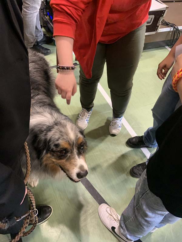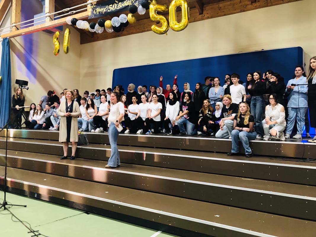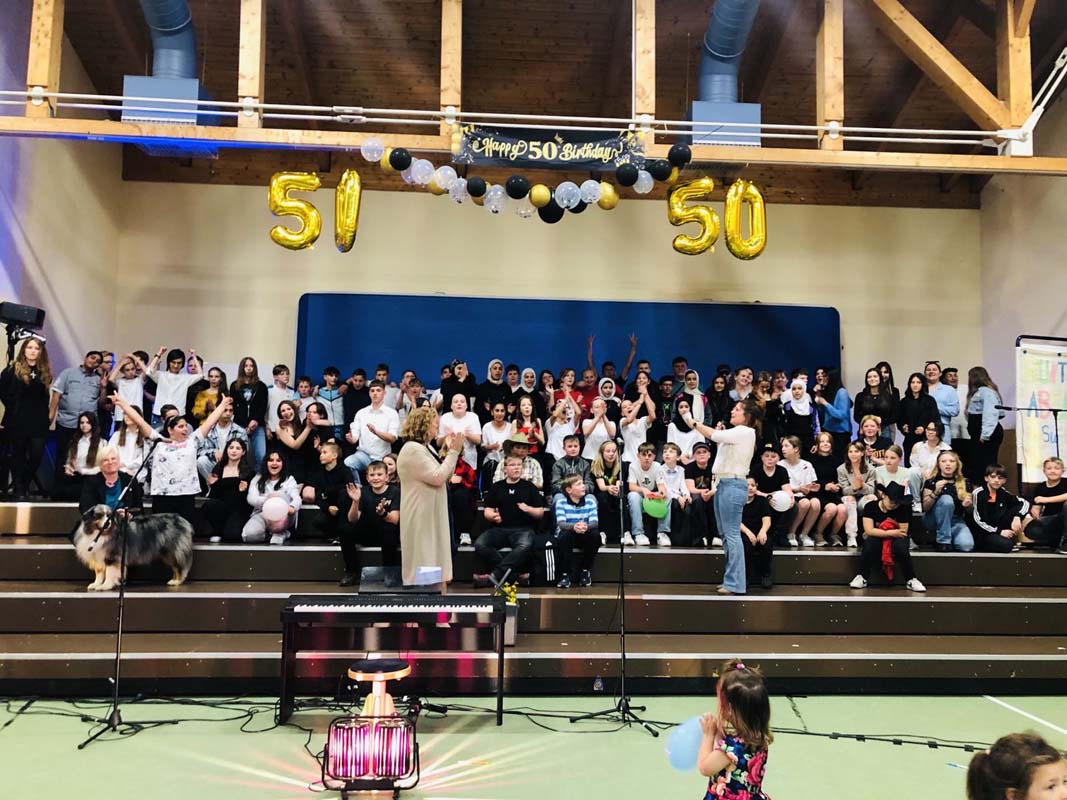 Ein weiteres Highlight war eine Zeitreise in die letzten 50 Jahre der Schulgeschichte, aufgeführt von Schülerinnen und Schülern der Jahrgangsstufen 6 und R9. Schulhund Merlin gab sein Debüt mit der Klasse F6b.