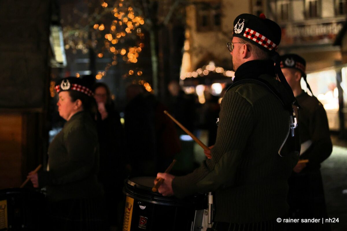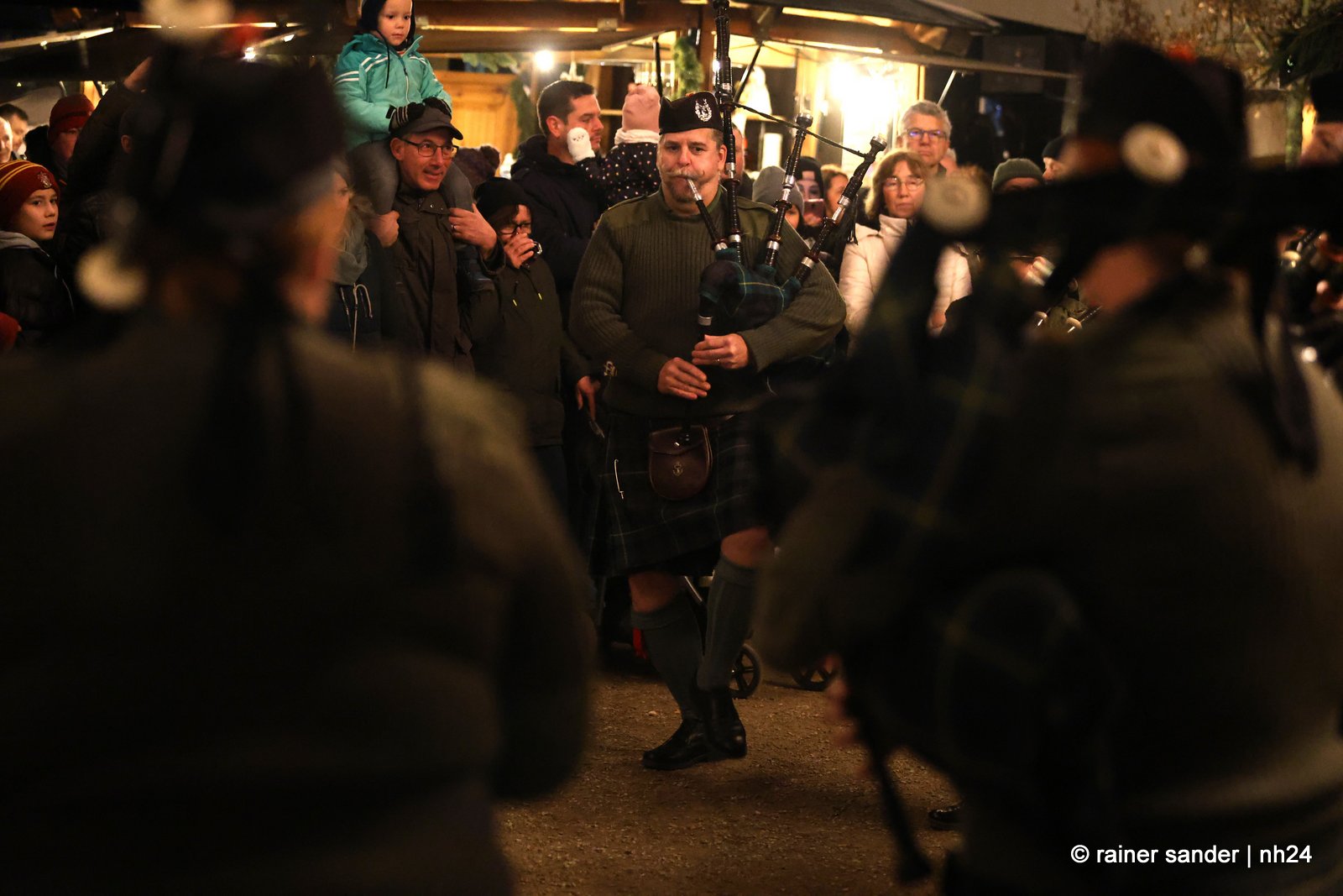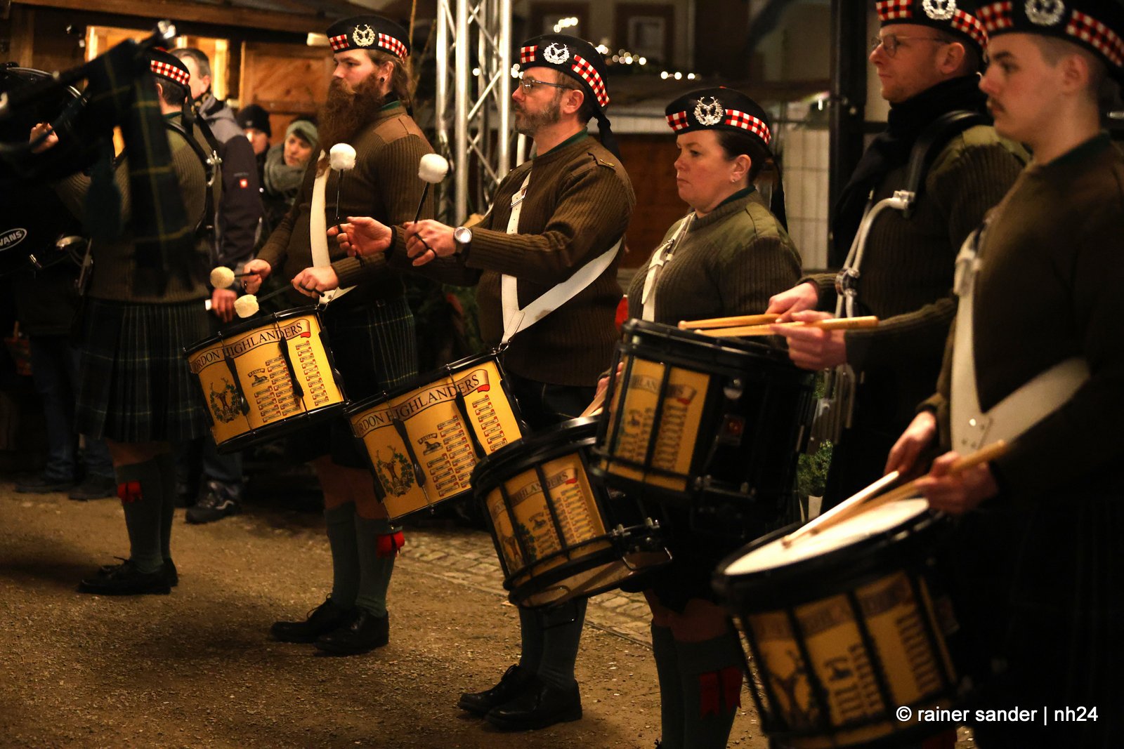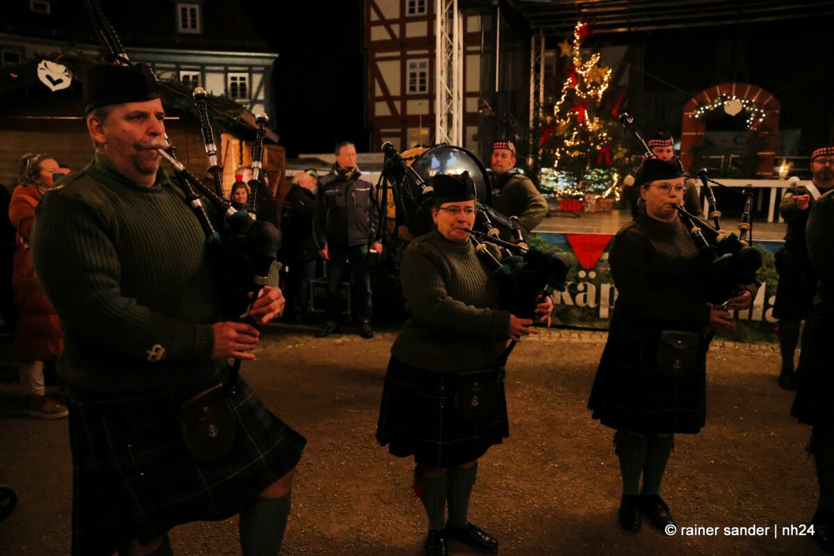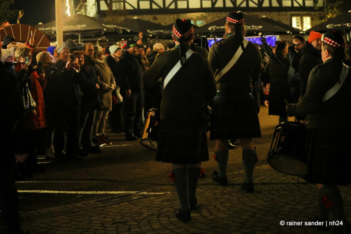 Zuvor marschierten „Targe of Gordon“ aus Fulda, inzwischen ein fester Bestandteil des Schwälmer Weihnachtsmarktes mit Trommeln und Dudelsäcken auf den Paradeplatz. Ob Auld Lang Syne, Scotland the Brave oder Amazing Grace, jeder Titel sorgte für Gänsehaut. Targe of Gordon trägt die originalgetreue Regimentsuniform „Full No.1 Dress“ der ehemaligen Drums and Pipes of the 1st Batallion the Gordon Highlanders und wurden im Jahr 2002 in die Regimental Association des ehemaligen königlichen Regiments von Prince Charles aufgenommen.