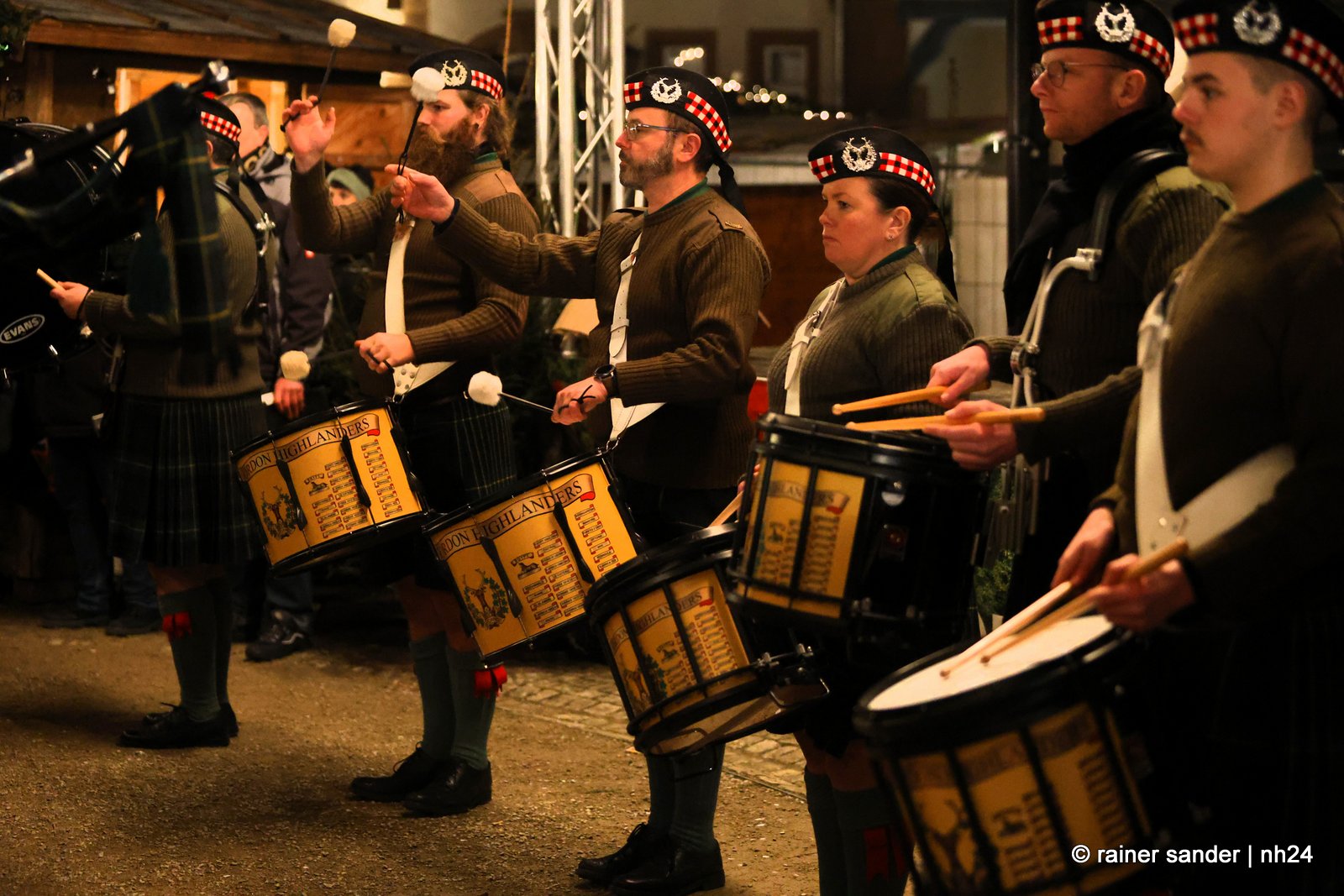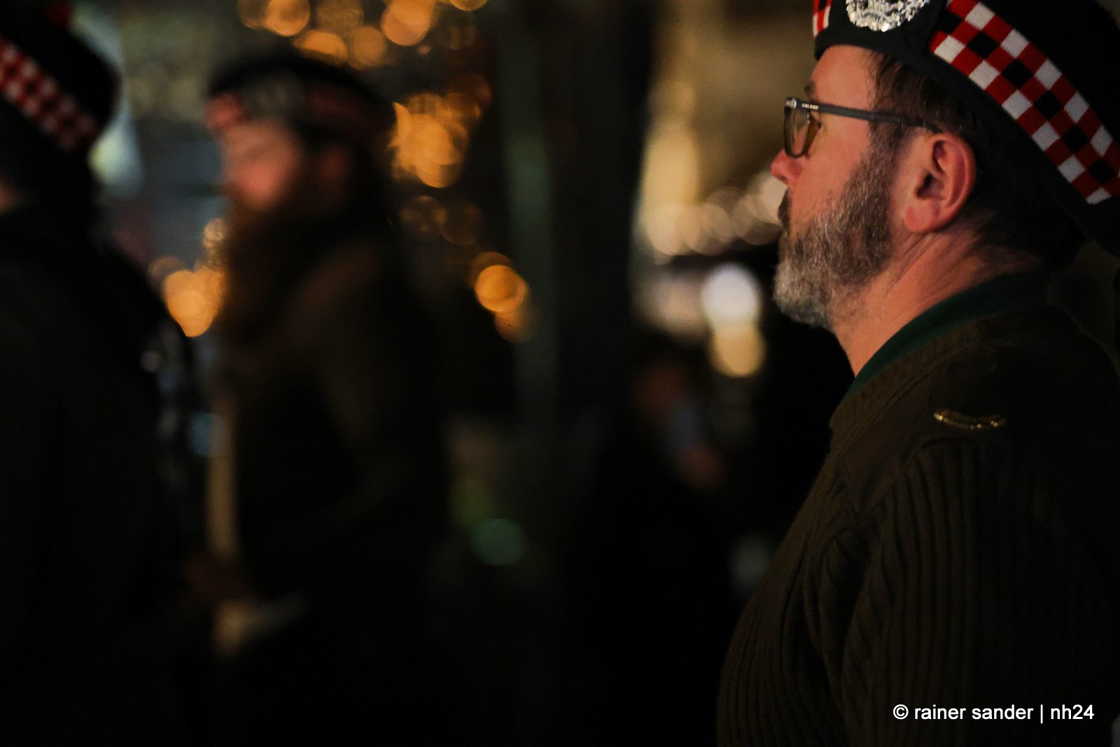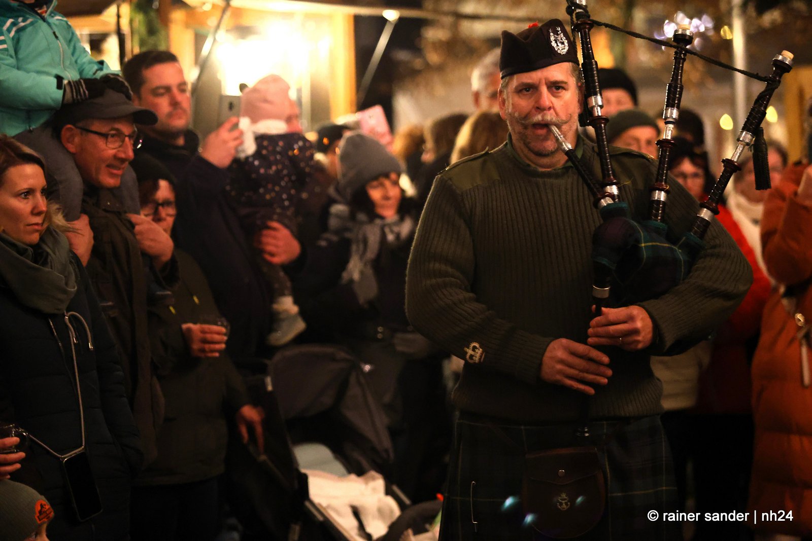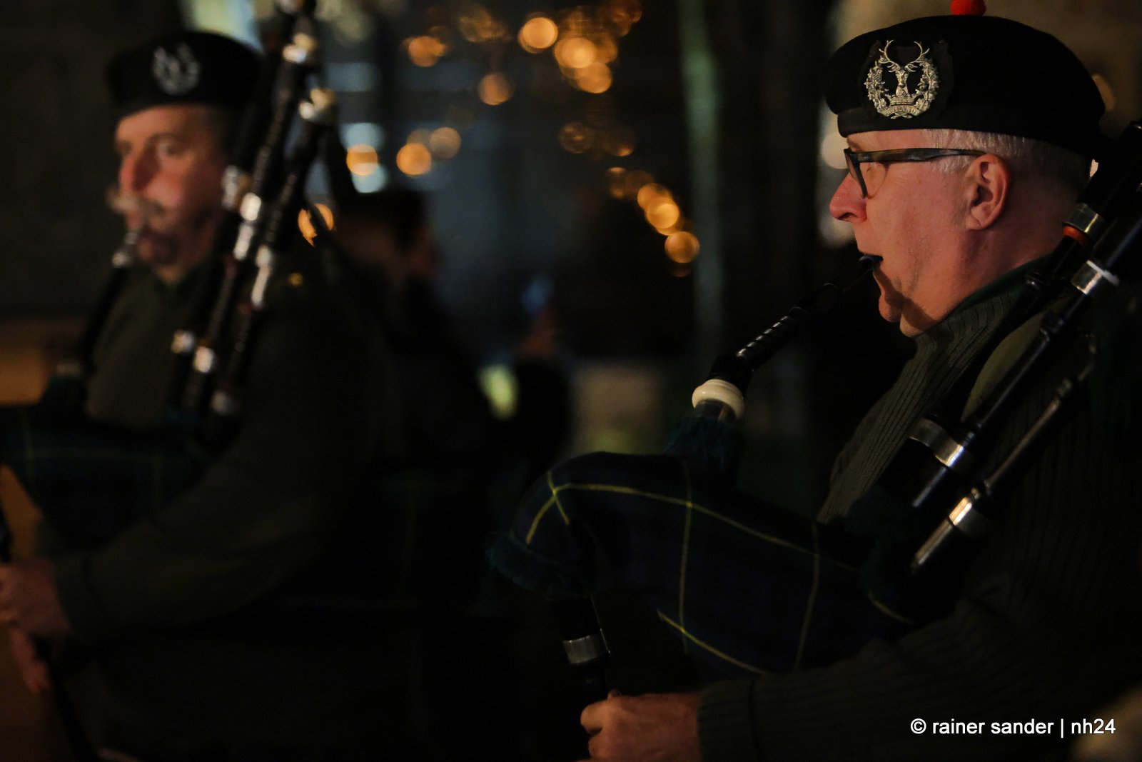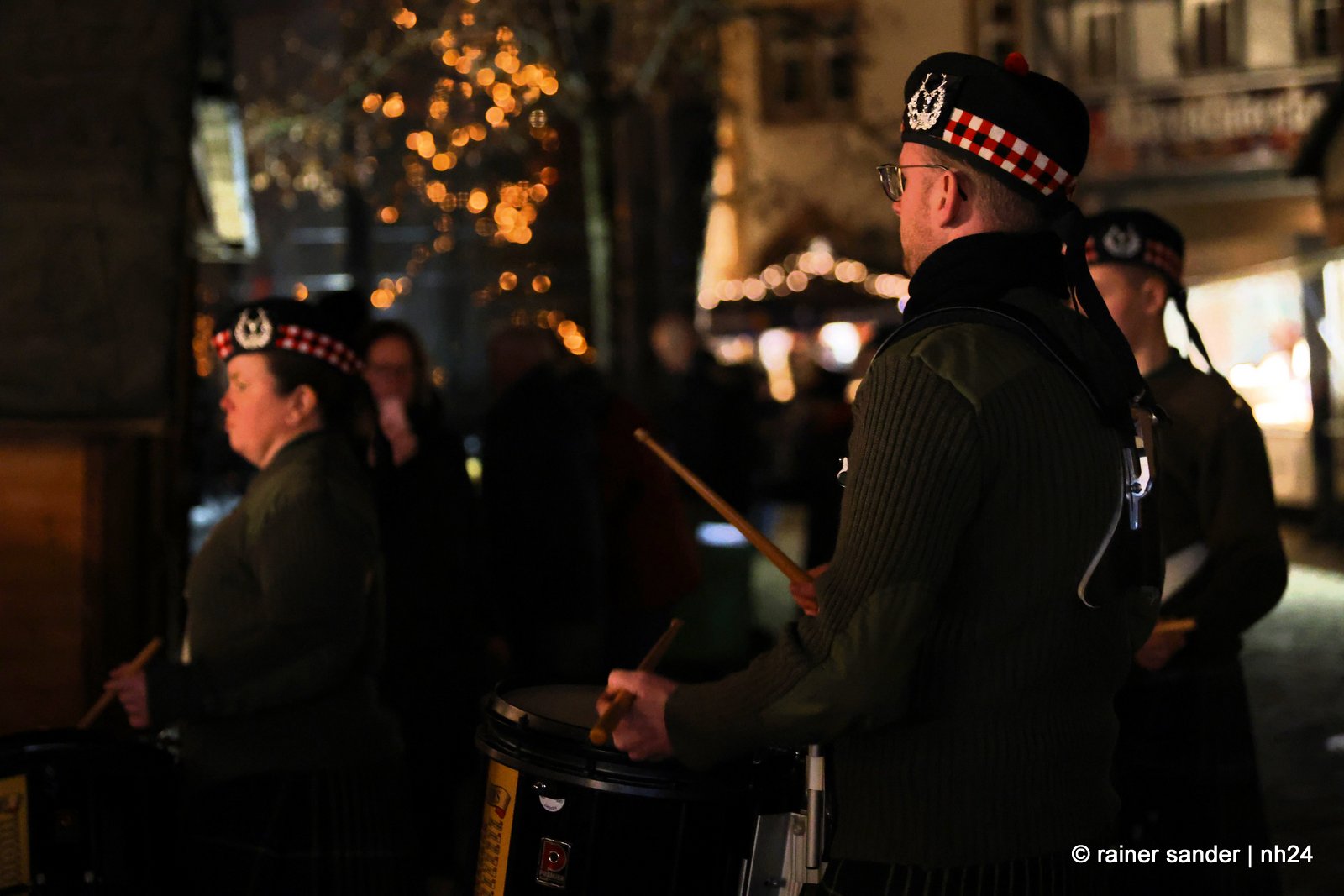 Zuvor marschierten „Targe of Gordon“ aus Fulda, inzwischen ein fester Bestandteil des Schwälmer Weihnachtsmarktes mit Trommeln und Dudelsäcken auf den Paradeplatz. Ob Auld Lang Syne, Scotland the Brave oder Amazing Grace, jeder Titel sorgte für Gänsehaut. Targe of Gordon trägt die originalgetreue Regimentsuniform „Full No.1 Dress“ der ehemaligen Drums and Pipes of the 1st Batallion the Gordon Highlanders und wurden im Jahr 2002 in die Regimental Association des ehemaligen königlichen Regiments von Prince Charles aufgenommen.