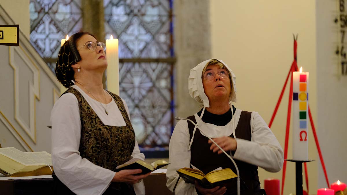 Kunigunde von Lüder und die Schankwirtin Johanna nahmen die Besucher auf eine Zeitreise ins 16. Jahrhundert mit. Sie erzählten aus dem Leben von Heinz von Lüder (* 1490 bis † 1559), einem bedeutenden Vertreter der Schwälmer Geschichte. Zum Abschluss stimmten sie gemeinsam mit den Anwesenden das Lutherlied „Vom Himmel hoch, da komm ich her“ an – ein bewegender Moment.