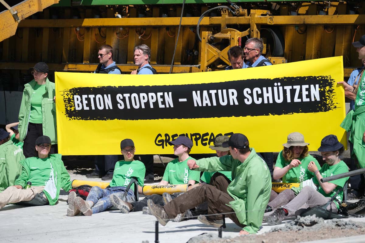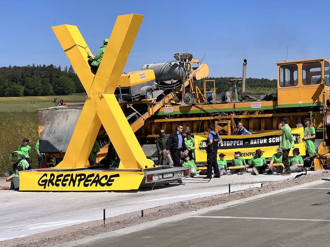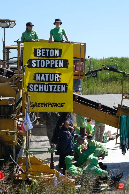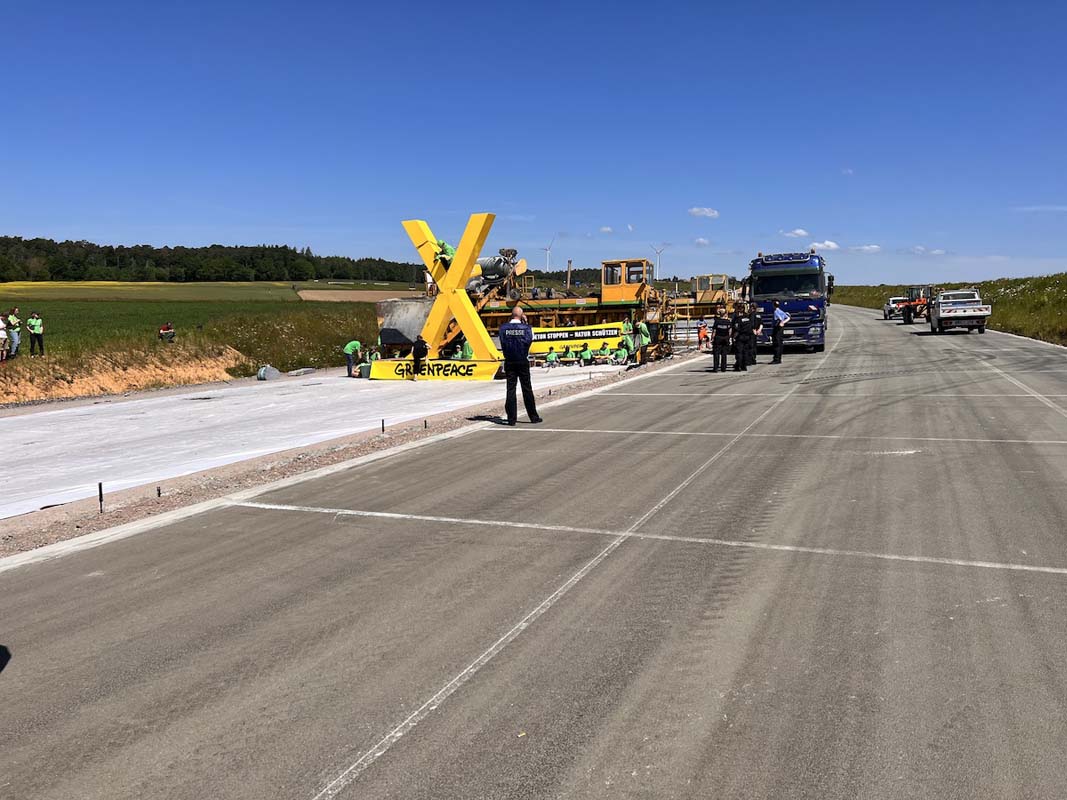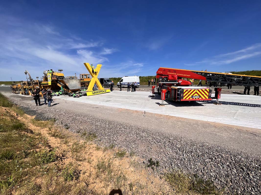 SCHWALMSTADT. 33 Aktivisten der Umweltschutzorganisation Greenpeace haben am Mittwoch an einer Protestaktion auf dem im Bau befindlichen Streckenabschnitt der Autobahn 49 in Schwalmstadt-Treysa (Schwalm-Eder-Kreis) demonstriert. Aktuell wird zwischen der Anschlussstelle Schwalmstadt und der in rund eineinhalb Kilometern Entfernung gelegenen Talbrücke die Südfahrbahn betoniert.