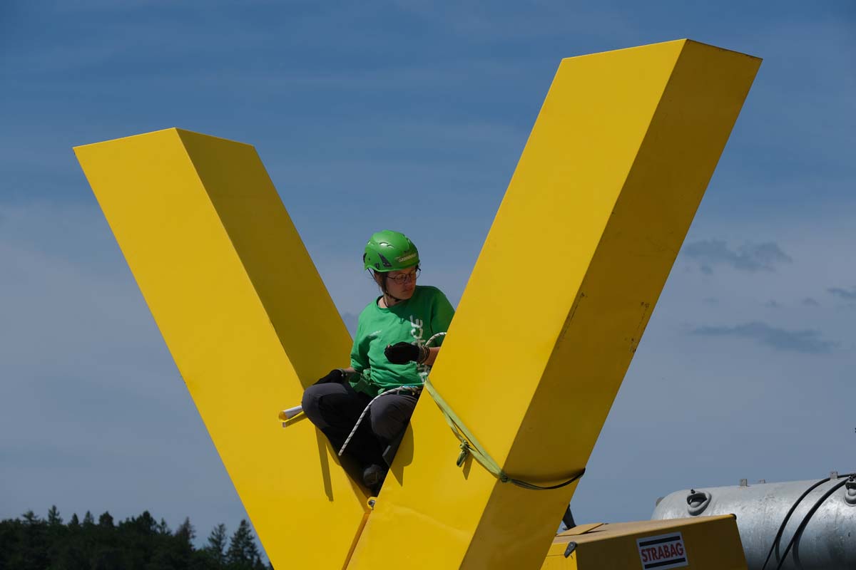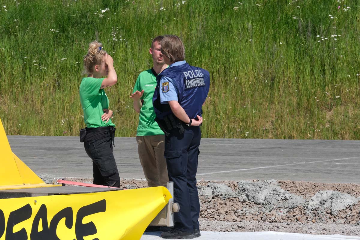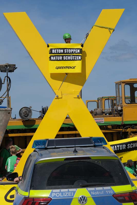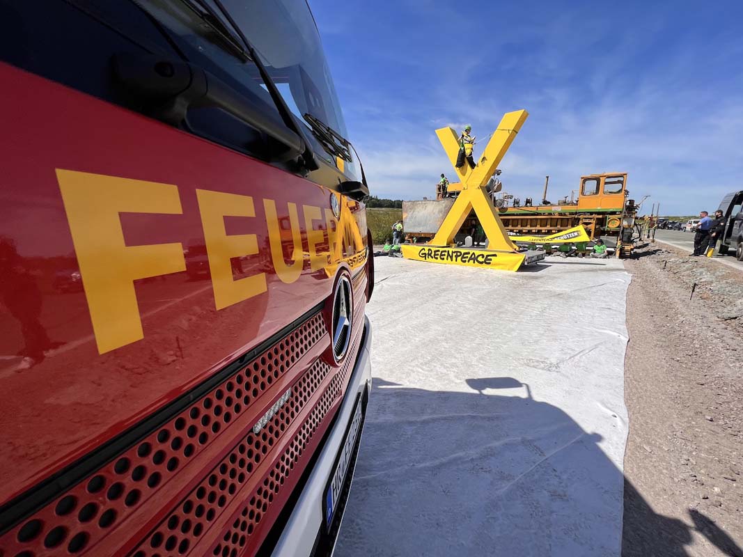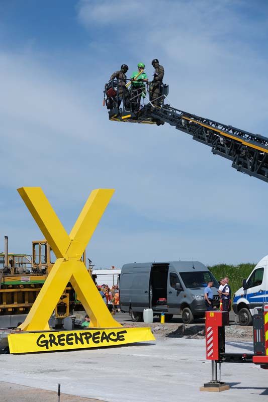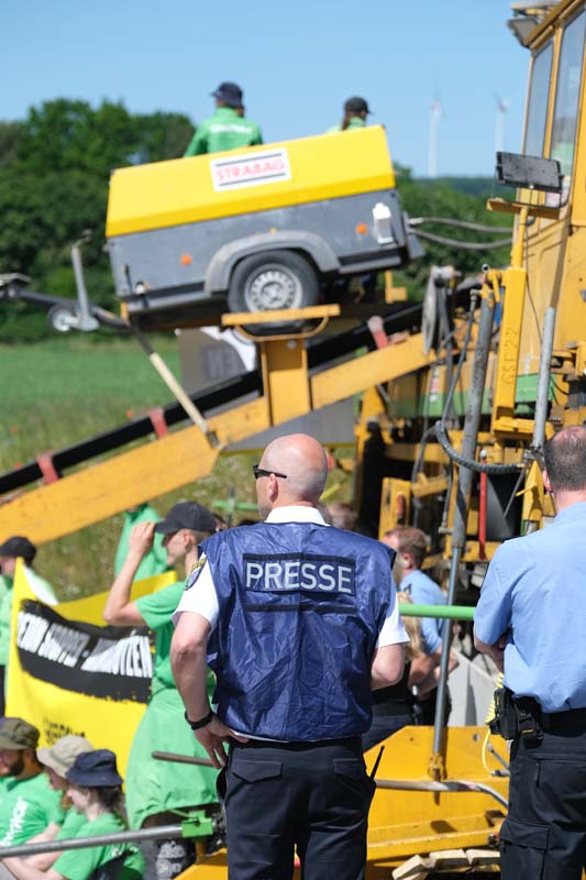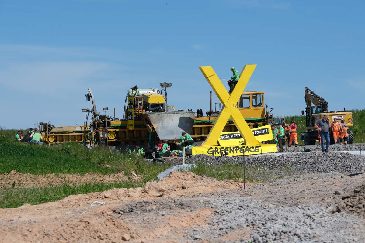 In der Folge ketteten sich Demonstranten an und auf der Maschine sowie einem auf einem Anhänger montierten mehrere Meter hohem gelben „X“ fest.