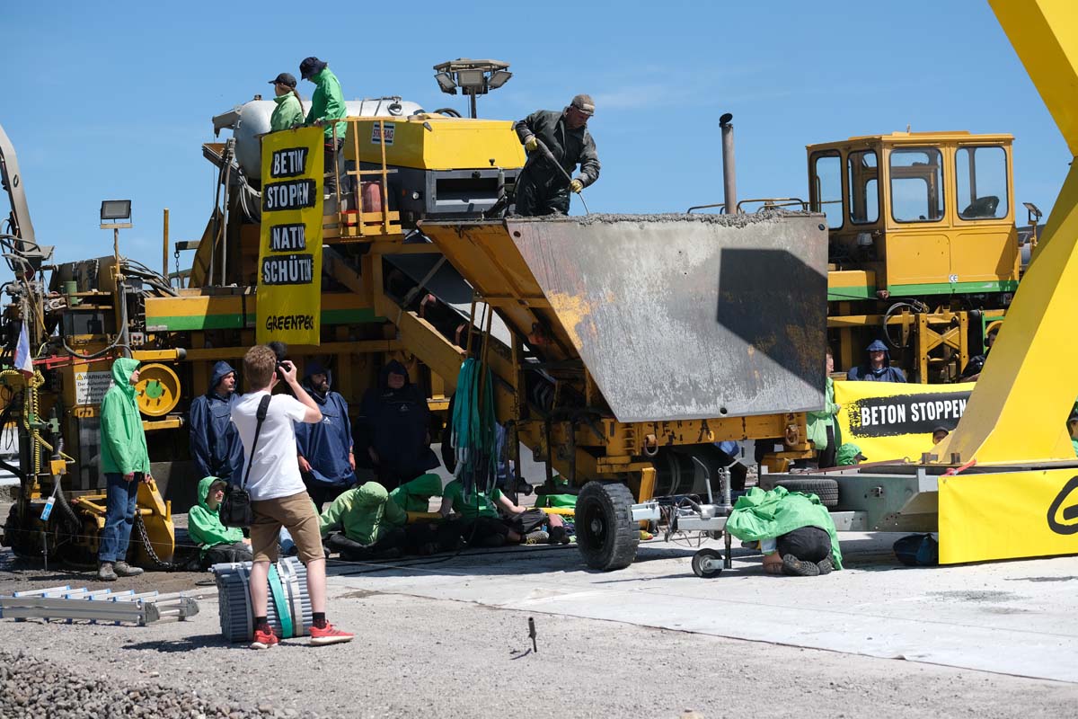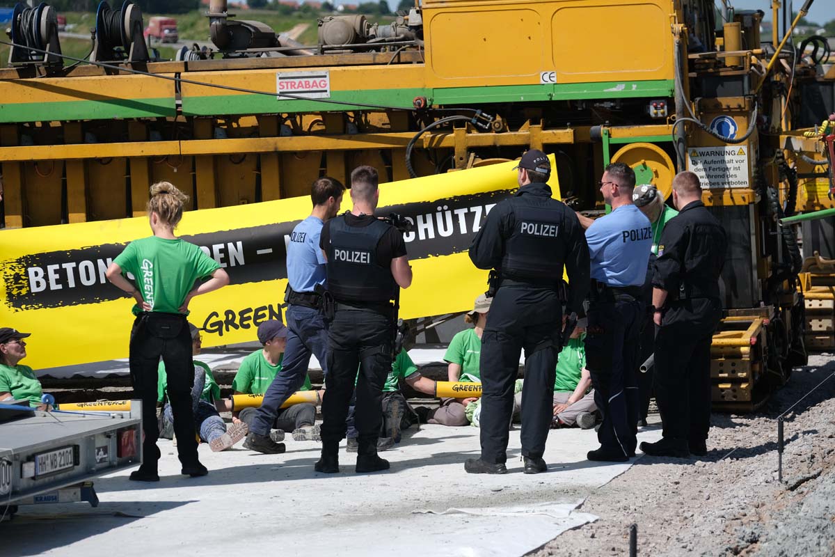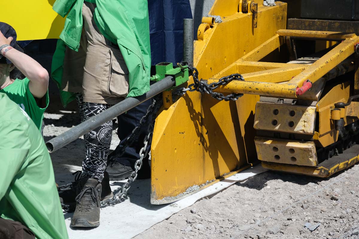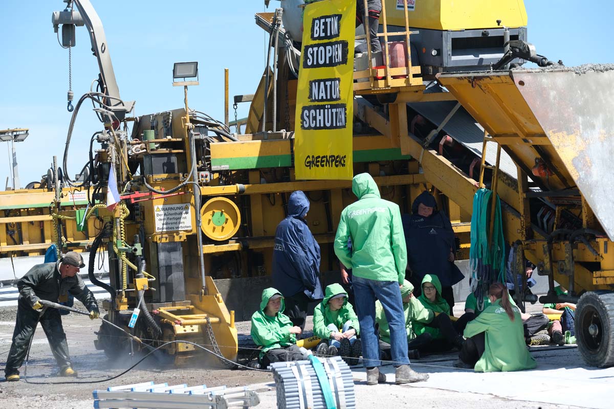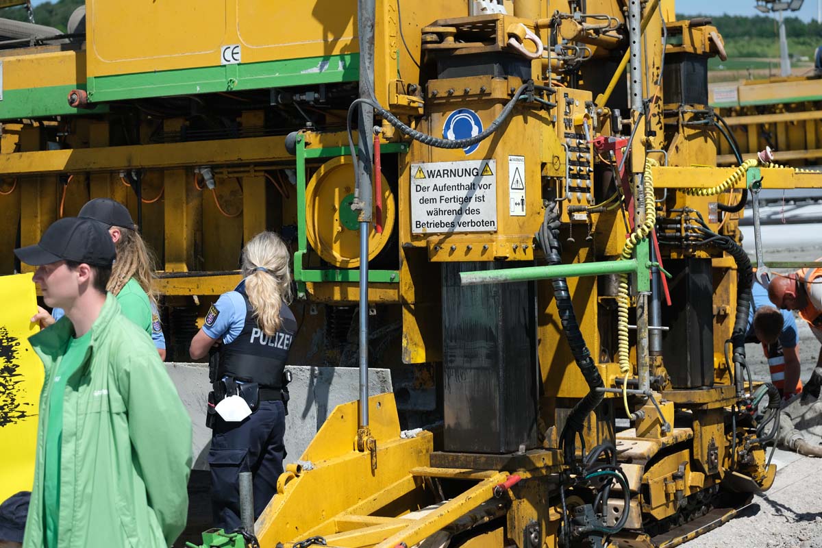 Um kurz nach 9 Uhr betätigten Aktivisten den Notausschalter des Betonfertigers, der dann auch sofort stoppte. In diesem Zusammenhang soll es auch zu einer verbalen Auseinandersetzung mit einem Arbeiter gekommen sein, der das Notaus der Maschine nicht so einfach hinnehmen wollte und der den Fertiger wieder in Betrieb setzte, trotz der Demonstranten im Gefahrenbereich.
