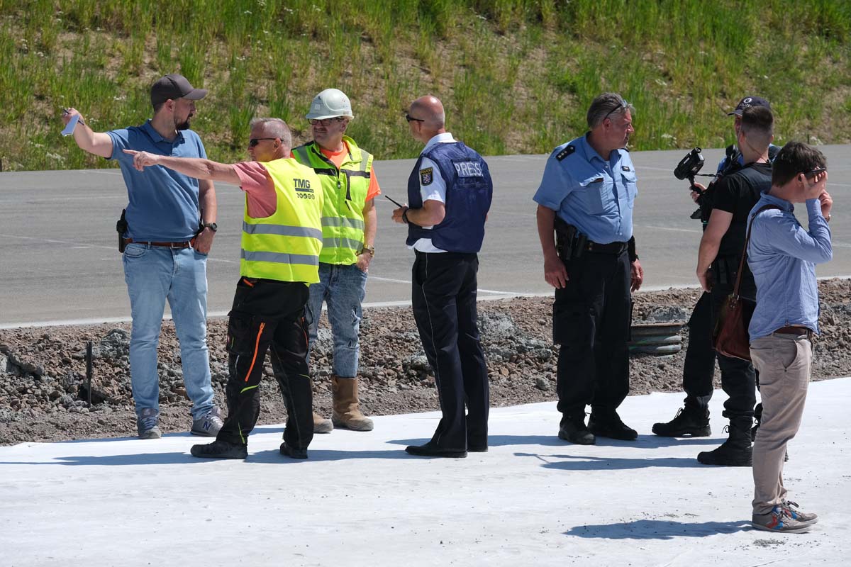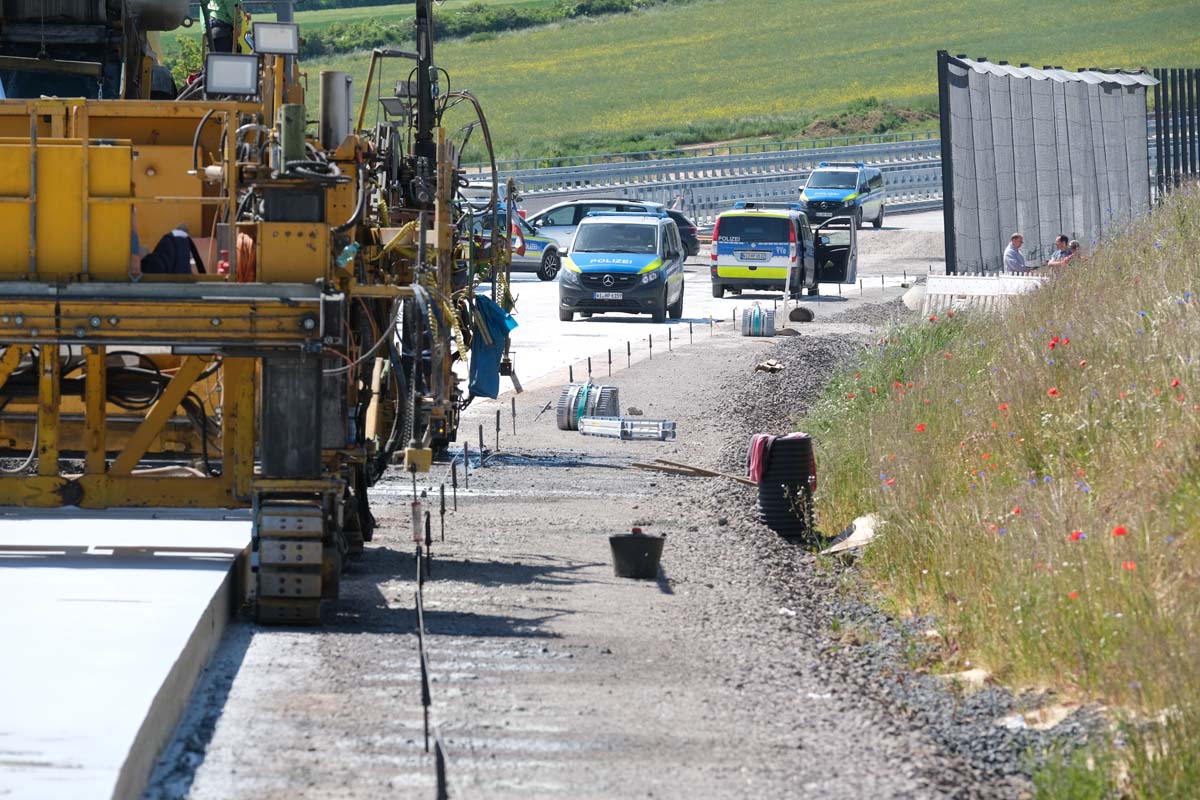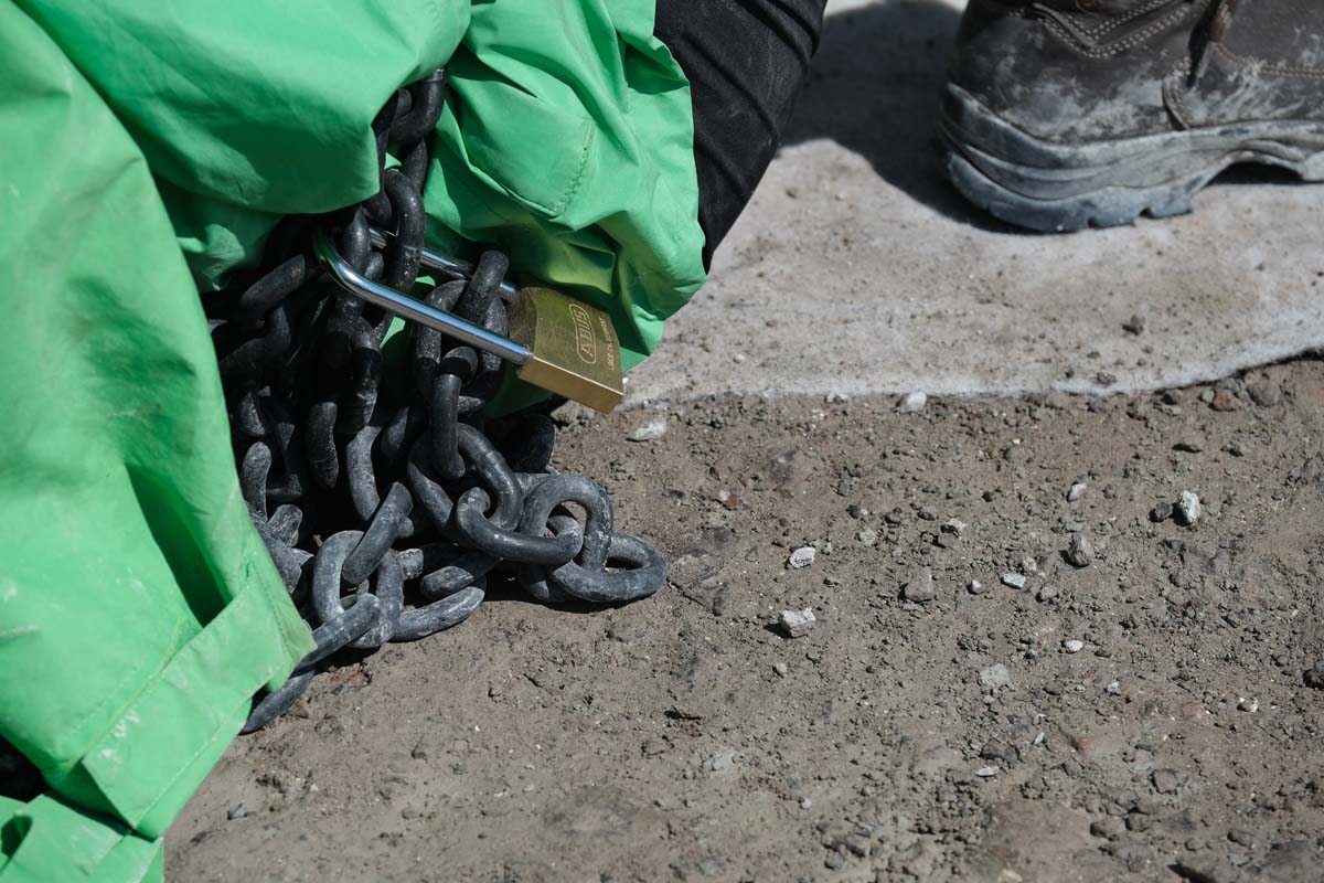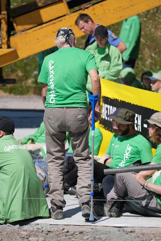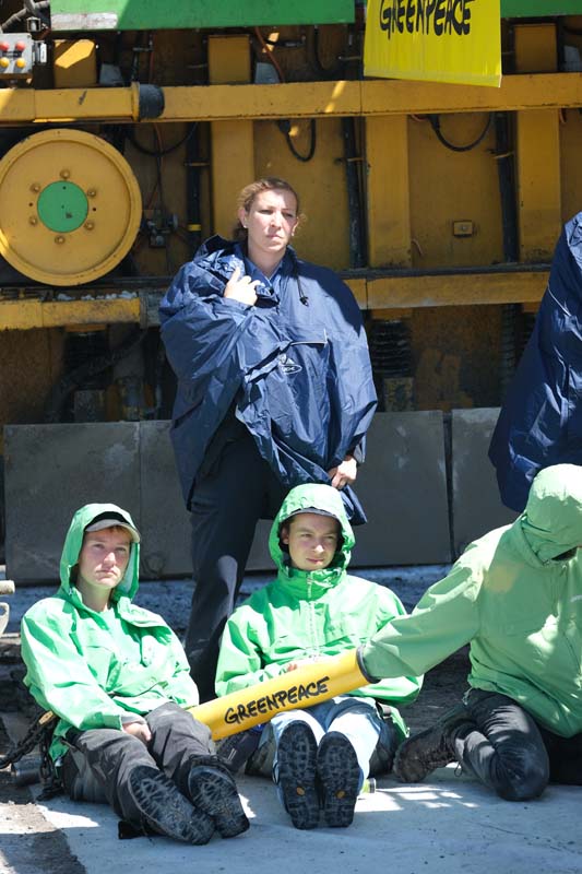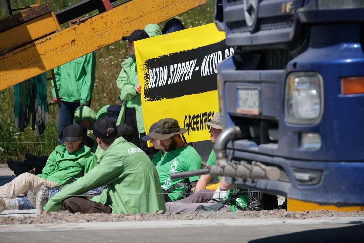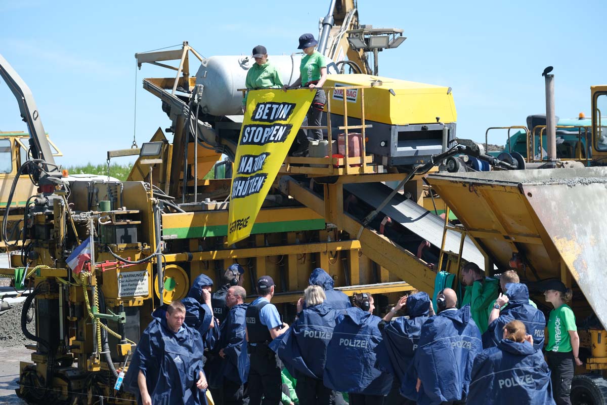 Um kurz nach 9 Uhr betätigten Aktivisten den Notausschalter des Betonfertigers, der dann auch sofort stoppte. In diesem Zusammenhang soll es auch zu einer verbalen Auseinandersetzung mit einem Arbeiter gekommen sein, der das Notaus der Maschine nicht so einfach hinnehmen wollte und der den Fertiger wieder in Betrieb setzte, trotz der Demonstranten im Gefahrenbereich.