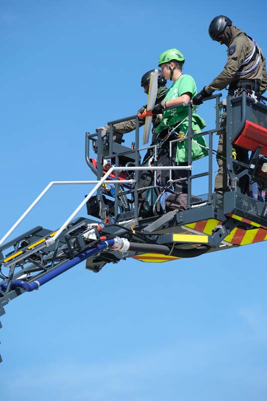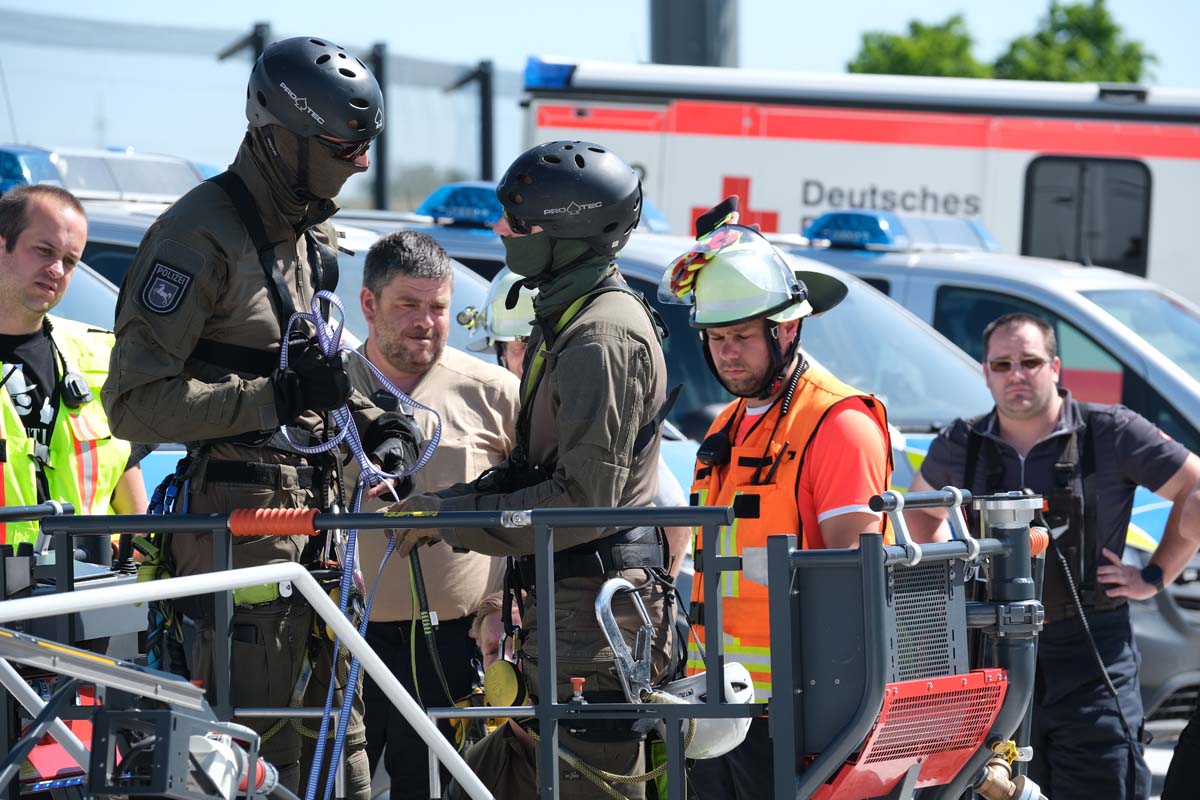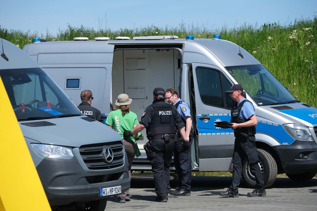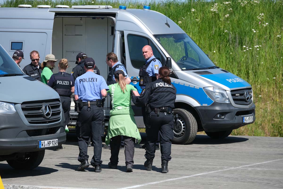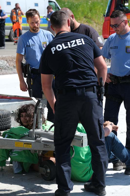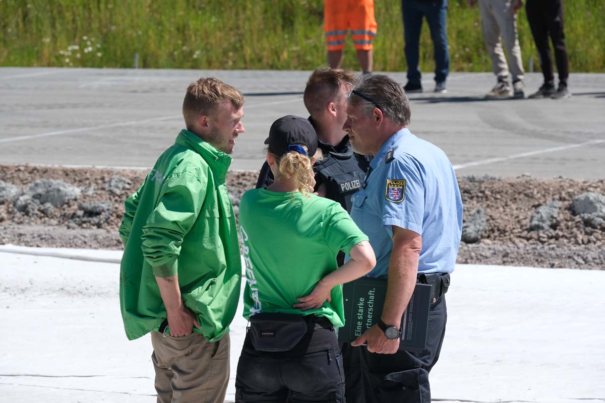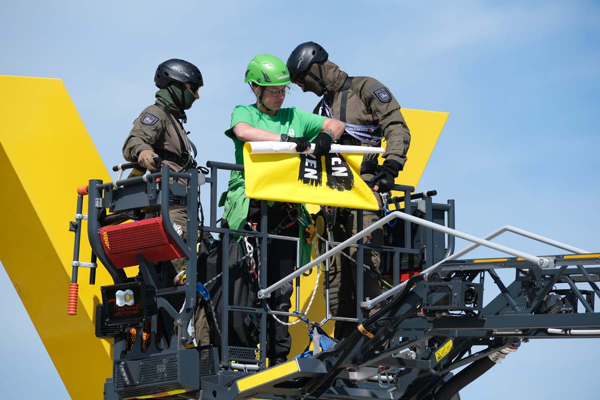 Die Polizei hatte die Einsatzkräfte verstärkt. Untere anderem trafen eine „Technische Einheit“ aus Südhessen und Spezialkräfte eines Sondereinsatzkommandos aus Niedersachsen ein, die die Demonstranten aus den Ketten befreien – ihre Arme hatten die Aktivisten in Röhren, die zudem mit einer verschlossenen Kette verbunden waren – und aus mehreren Meter Höhe herunterholen sollten. Für drei junge Frauen, eine war auf dem „X“ und zwei weitere Frauen auf dem Fertiger, kamen auch Feuerwehrleute aus Schwalmstadt zum Einsatz, die für die Spezialisten aus Niedersachsen die Drehleiter bedienten.
