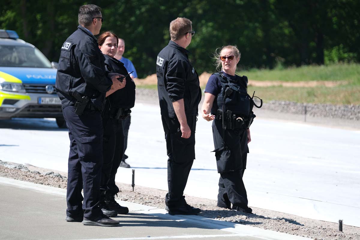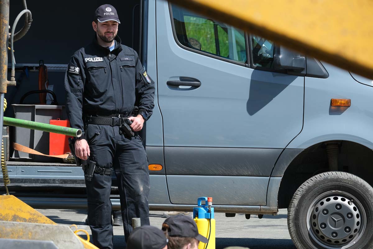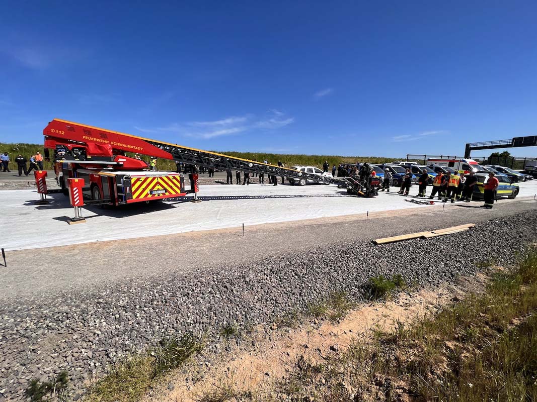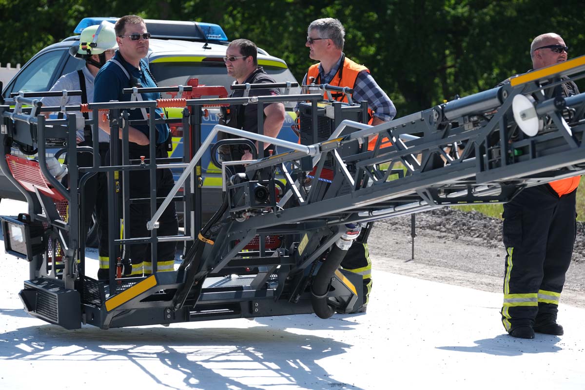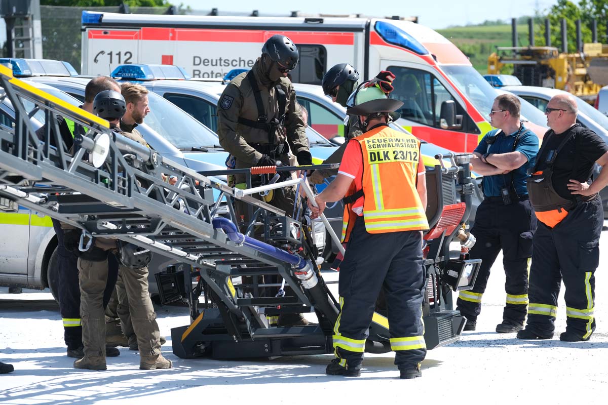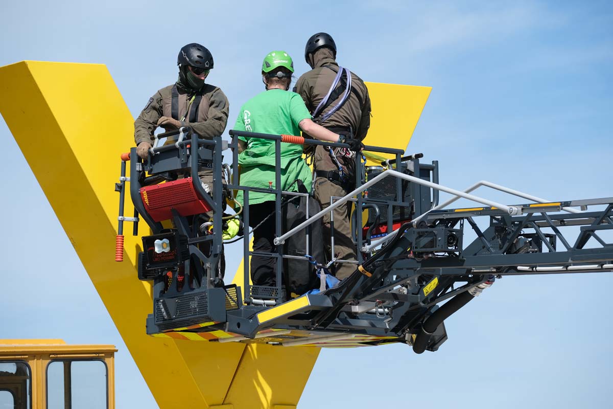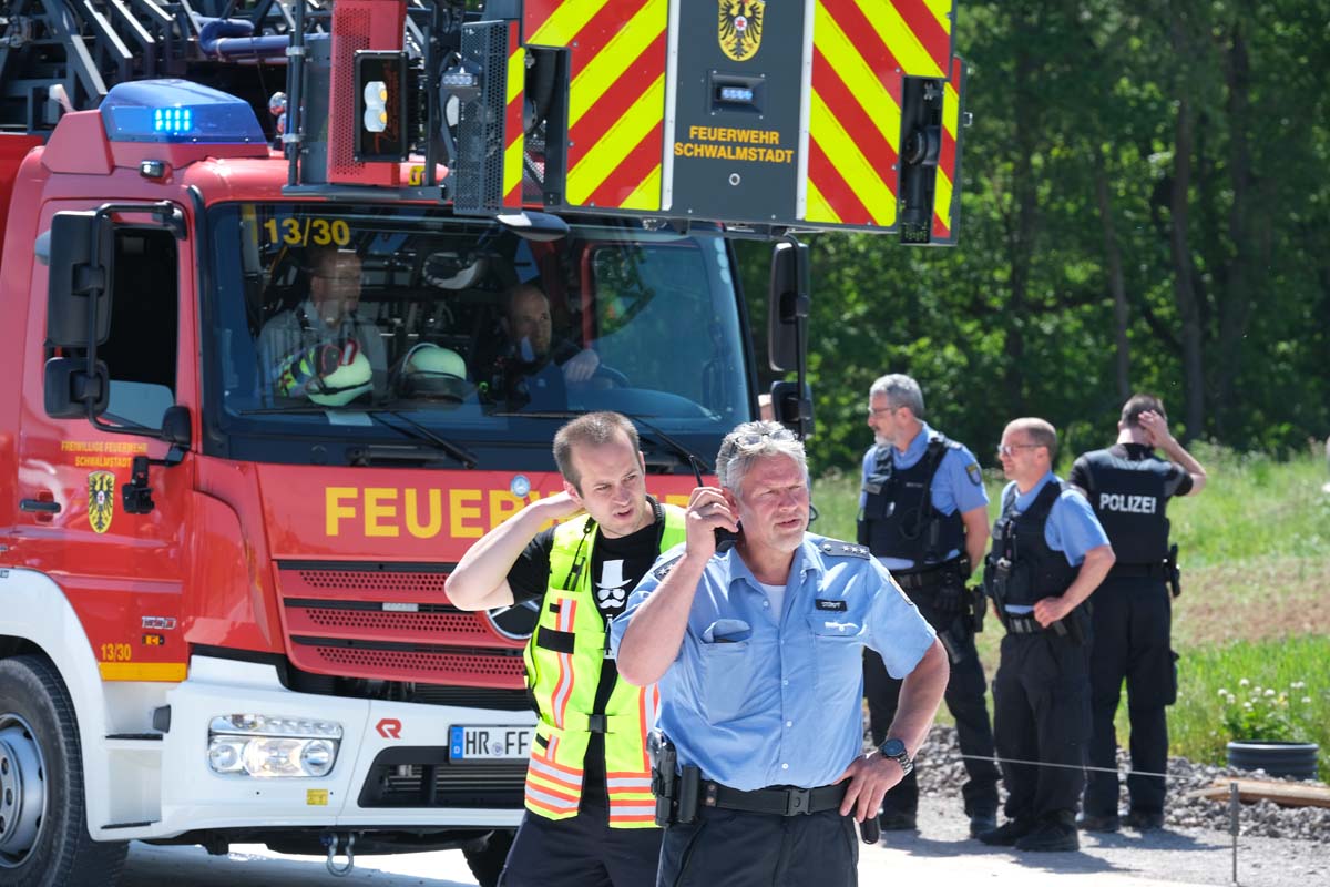 Die Polizei hatte die Einsatzkräfte verstärkt. Untere anderem trafen eine „Technische Einheit“ aus Südhessen und Spezialkräfte eines Sondereinsatzkommandos aus Niedersachsen ein, die die Demonstranten aus den Ketten befreien – ihre Arme hatten die Aktivisten in Röhren, die zudem mit einer verschlossenen Kette verbunden waren – und aus mehreren Meter Höhe herunterholen sollten. Für drei junge Frauen, eine war auf dem „X“ und zwei weitere Frauen auf dem Fertiger, kamen auch Feuerwehrleute aus Schwalmstadt zum Einsatz, die für die Spezialisten aus Niedersachsen die Drehleiter bedienten.