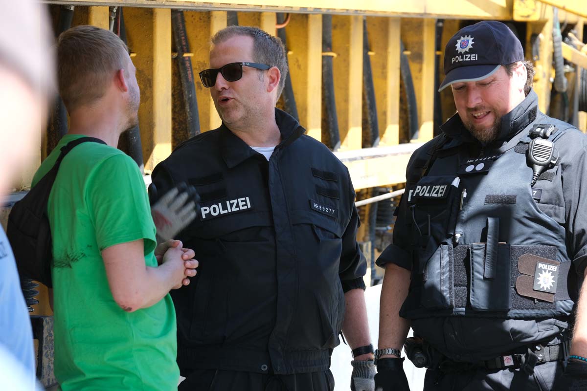 Die Beamten begannen um kurz vor 16 Uhr, nach der mehrmaligen Aufforderung, den Fertiger freizugeben und den Bereich freiwillig zu verlassen, die Demonstranten mit gutem Zureden zu entfernen. Die Frauen und Männer gaben sich ihrem Schicksal hin und ließen sich dann friedlich und widerstandslos zu den bereitgestellten Gefangenentransportern bringen.