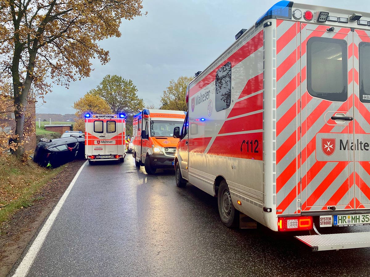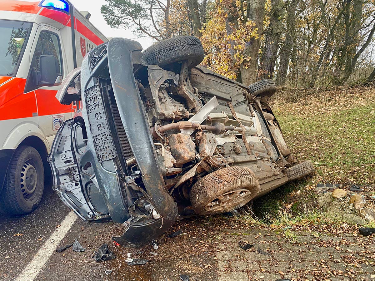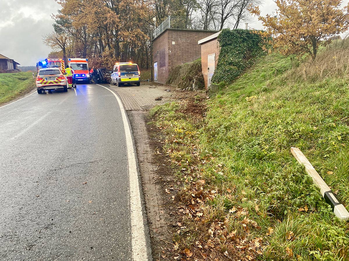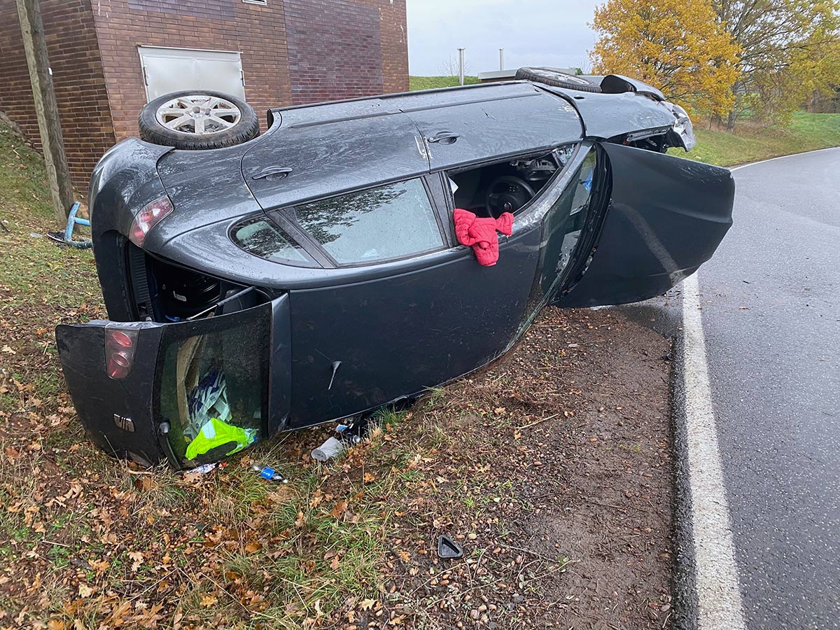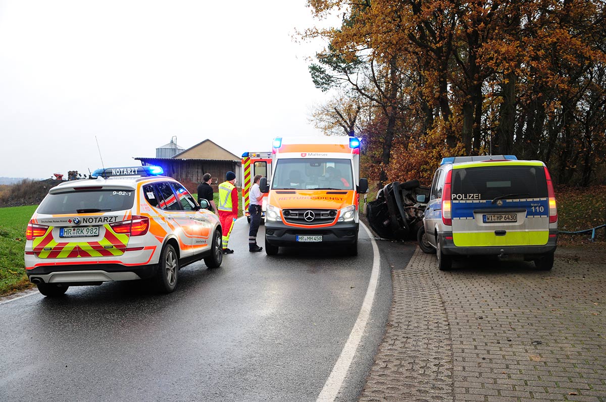 Ein 46-jähriger Schwalmstädter war mit seinem Pkw auf der L 3145 von Dittershausen in Richtung Elnrode unterwegs, als ihm ausgangs einer leichten Rechtskurve ein Lkw entgegenkam. Der Mann erschrak und wich nach rechts auf die Bankette aus. Anschließend prallte er im Bereich des Wasserhäuschens gegen einige Pflanzsteine und einige Meter weiter gegen ein Geländer. Dabei überschlug sich das mit insgesamt drei Personen besetzte Fahrzeug und kam auf der Beifahrerseite liegend zum Stillstand.