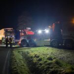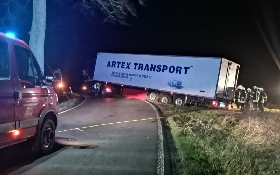 Nach Angaben der Feuerwehr war der LKW-Fahrer dem Navigationsgerät gefolgt. Bei seinem Wendemanöver in einen Wiesenweg setzte sich der mit 15 Tonnen Schokolade beladene Auflieger neben der Fahrbahn fest. Die Zugmaschine kam zwar auf der Fahrbahn zum Stehen, war aber nicht mehr in der Lage, den mit den Achsen über einem Graben hängenden Auflieger aus eigener Kraft aus der misslichen Lage zu ziehen. Auch die alarmierte Feuerwehr aus Allendorf-Landsburg war hier machtlos.
