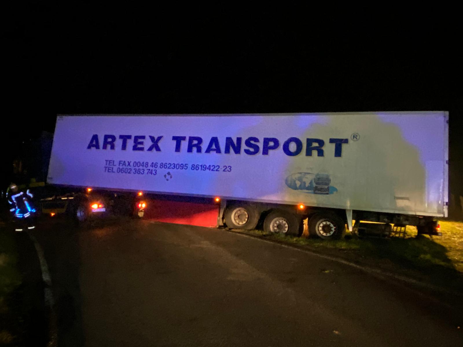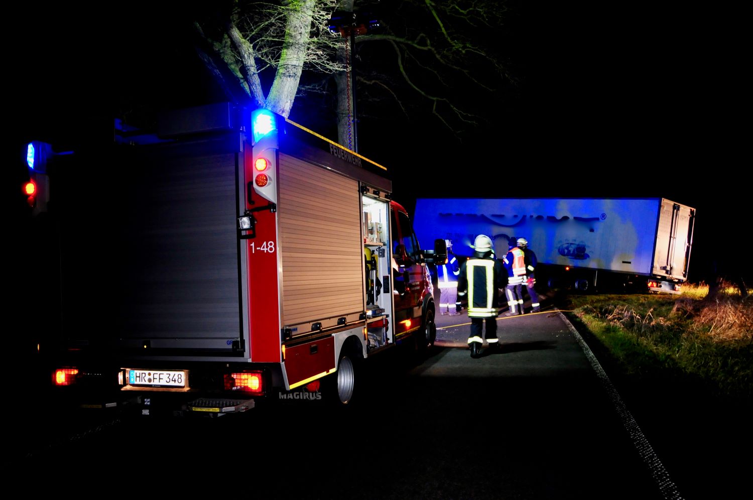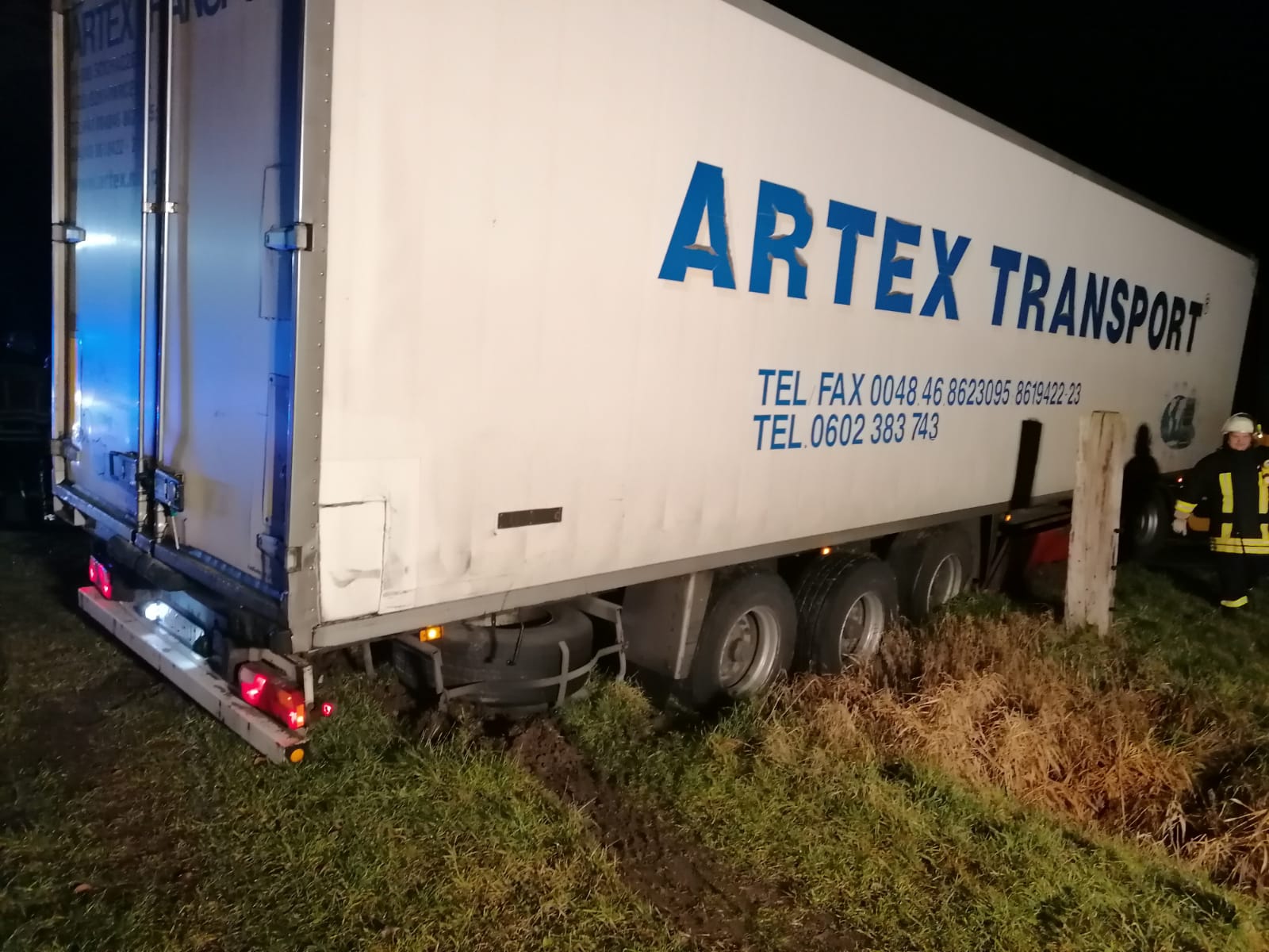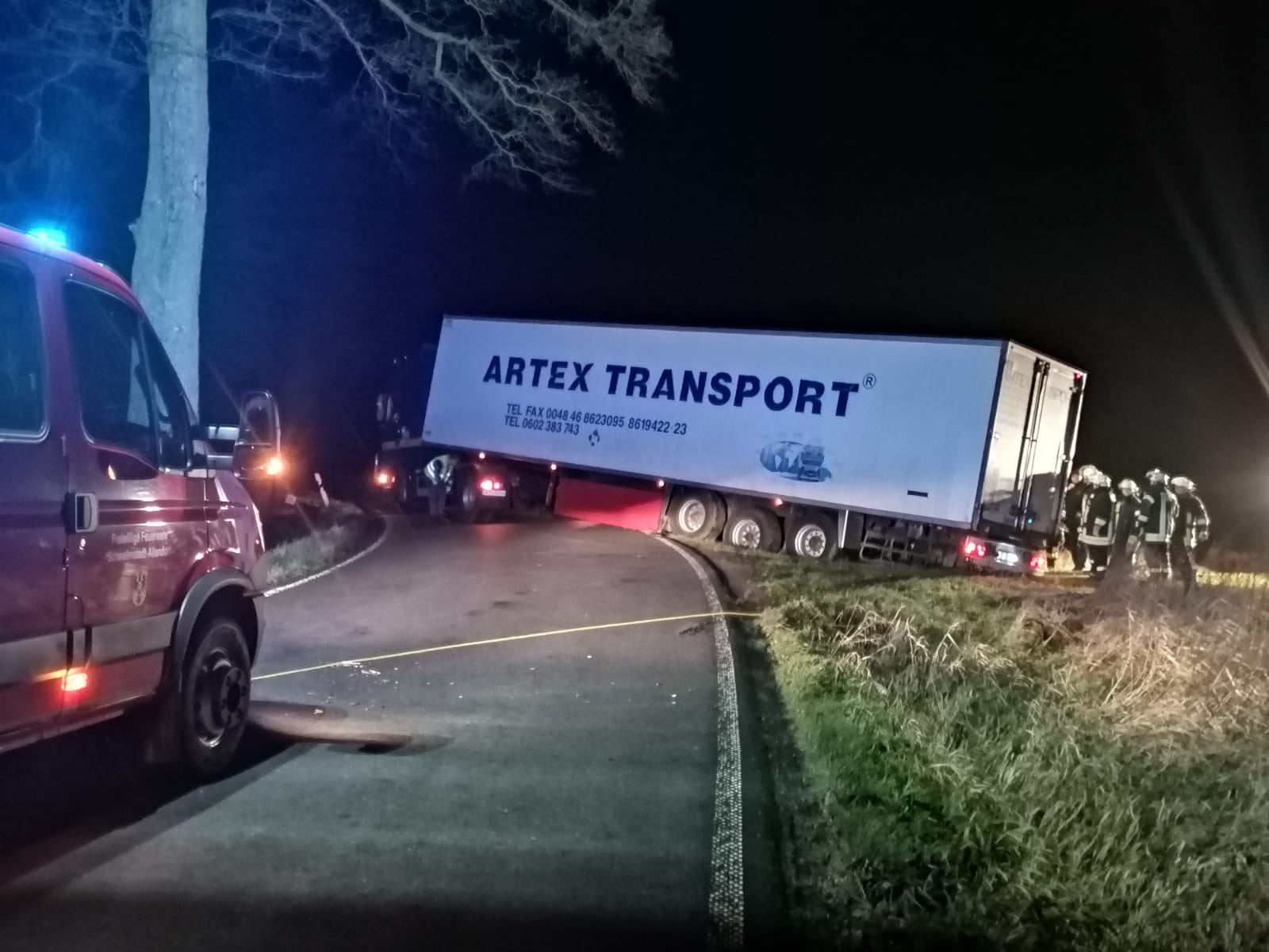 Nach Angaben der Feuerwehr war der LKW-Fahrer dem Navigationsgerät gefolgt. Bei seinem Wendemanöver in einen Wiesenweg setzte sich der mit 15 Tonnen Schokolade beladene Auflieger neben der Fahrbahn fest. Die Zugmaschine kam zwar auf der Fahrbahn zum Stehen, war aber nicht mehr in der Lage, den mit den Achsen über einem Graben hängenden Auflieger aus eigener Kraft aus der misslichen Lage zu ziehen. Auch die alarmierte Feuerwehr aus Allendorf-Landsburg war hier machtlos.