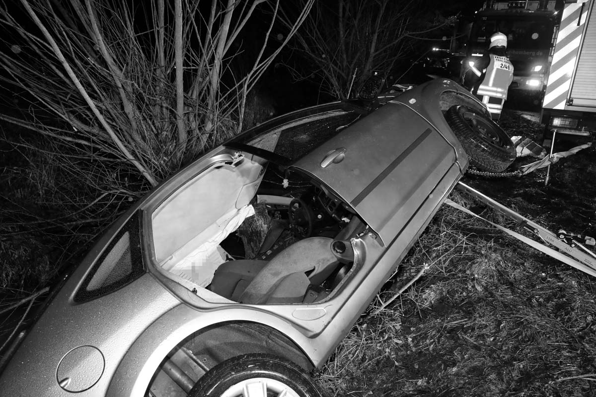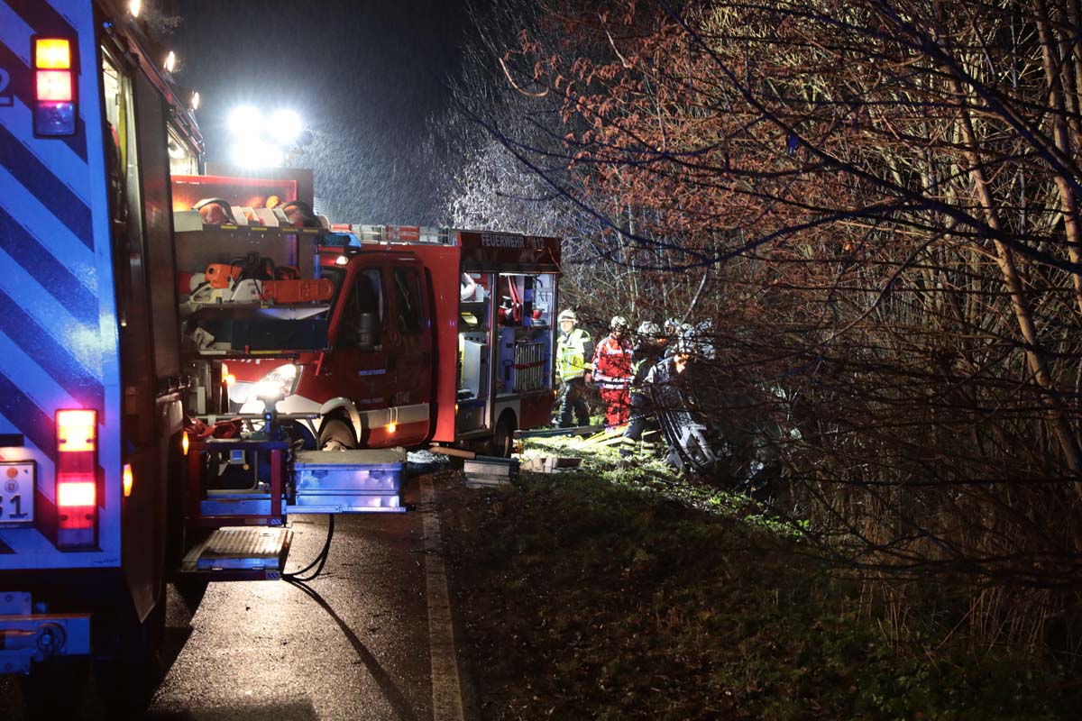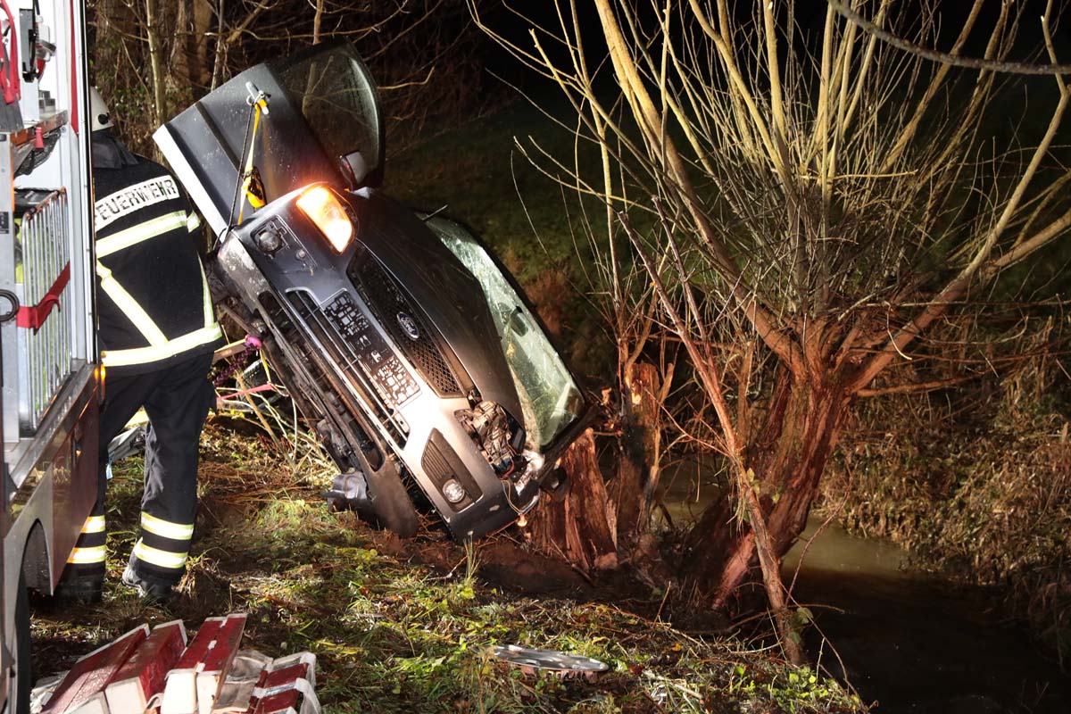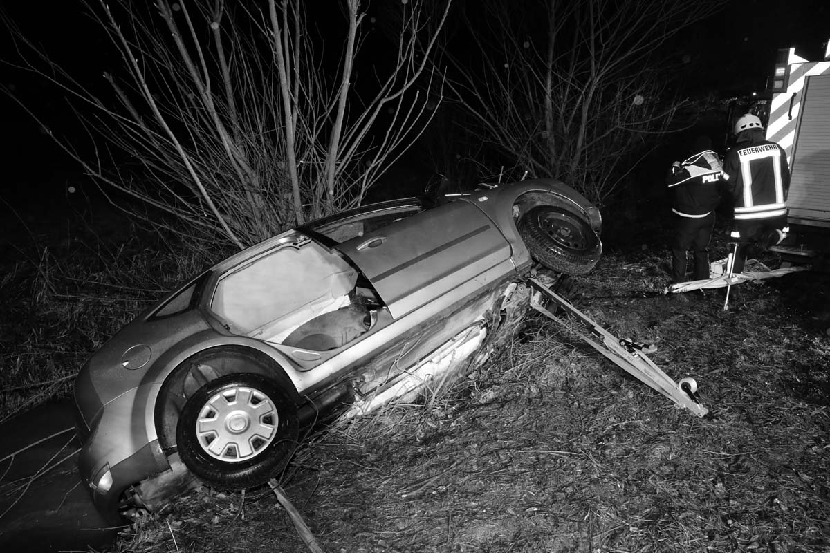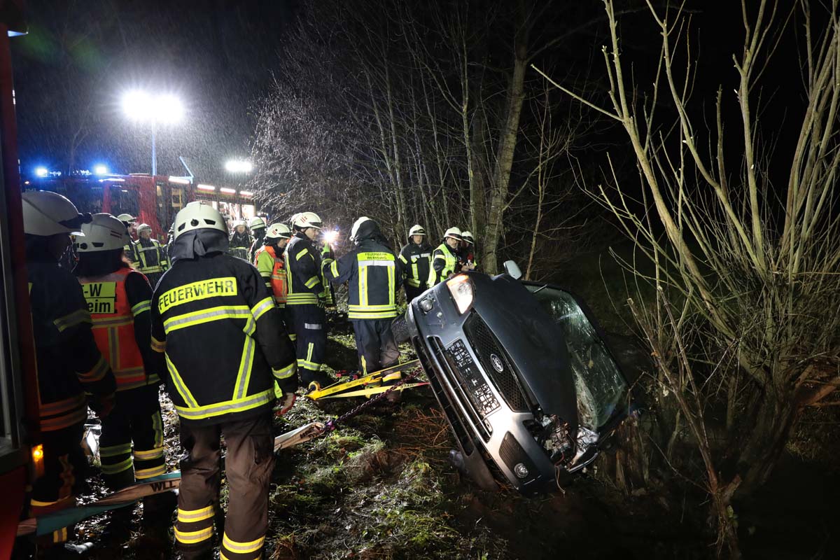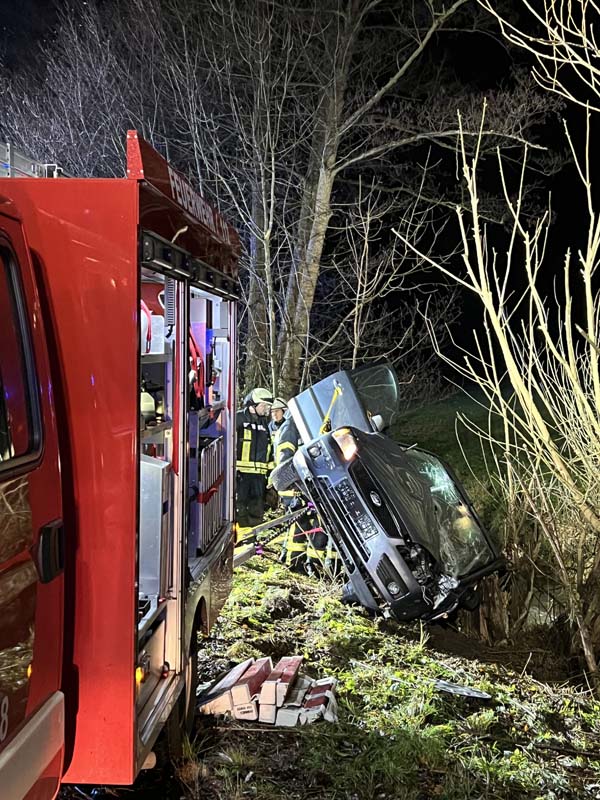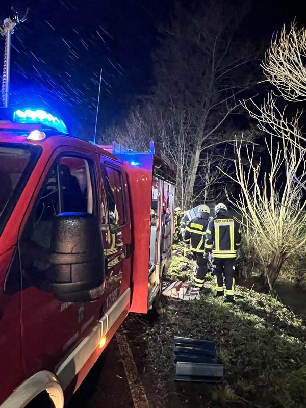Das Fahrzeug prallte gegen mehrere Bäume, wobei ein kräftiger Stamm ins Fahrzeuginnere eindrang und die schweren Verletzungen der Autofahrerin mit verursachte. Der Pkw kam mit dem Heck im Rinnebach, der aufgrund des Schmelzwassers viel Wasser führte, und an einem Baumstamm hängend, zum Stillstand. Ersthelfer alarmierten die Rettungskräfte, die zunächst den Pkw absicherten, um bei den Rettungsmaßnahmen nicht selbst in Gefahr zu geraten.