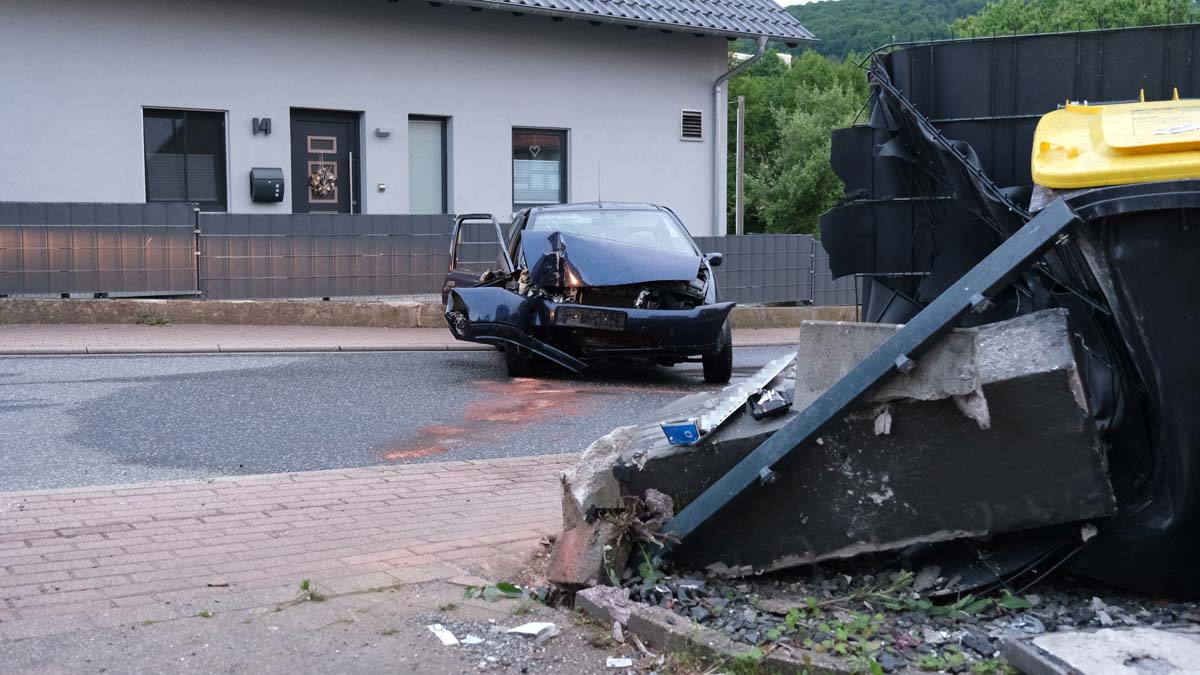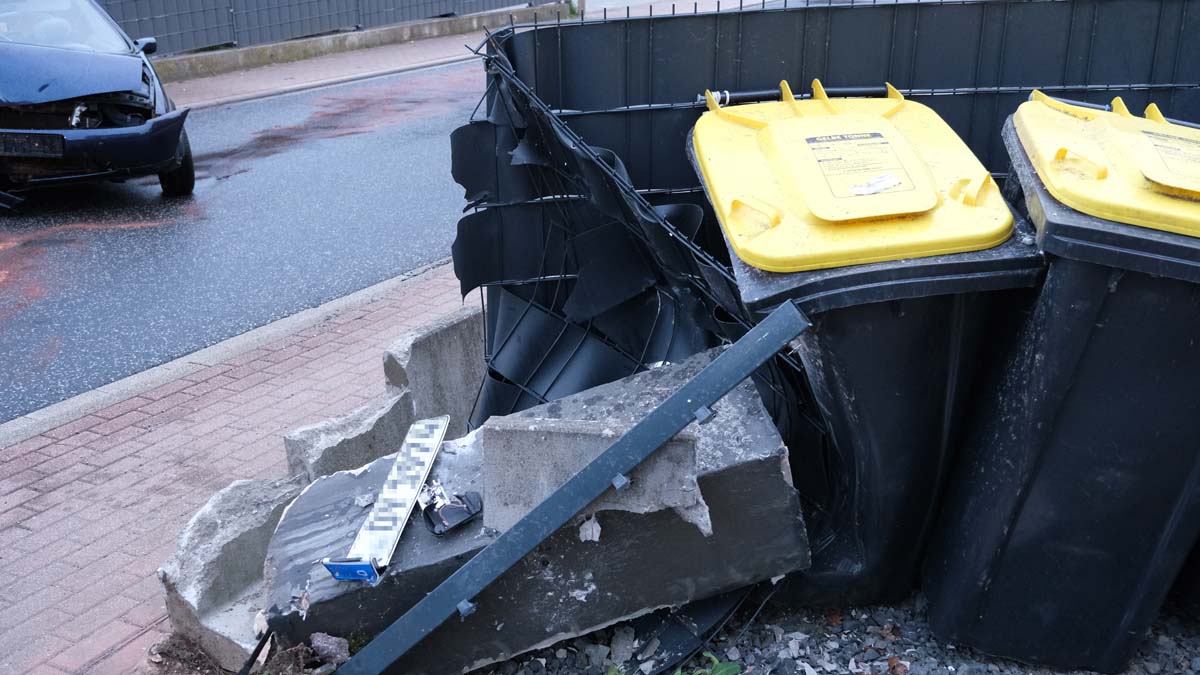Am Fahrzeug entstand wirtschaftlicher Totalschaden. Neben der Grundstücksbegrenzung und der Betonstele wurden auch ein Zaun und Mülltonnen beschädigt. Der Sachschaden dürfte im hohen vierstelligen Bereich liegen.