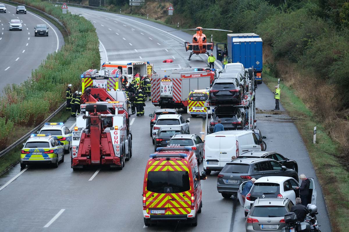 Auf der Autobahn 7, wenige hundert Meter hinter der Anschlussstelle Malsfeld, verunglückte ein 26-jähriger Fahrer eines Golfs am Morgen gegen 10 Uhr. Vermutlich aufgrund nicht angepasster Geschwindigkeit verlor der junge Mann auf dem Weg in Richtung der Tank- und Rastanlage Hasselberg die Kontrolle über sein Fahrzeug. Der Golf schleuderte nach rechts von der Fahrbahn, prallte heftig gegen einen Erdwall und wurde dabei durch die Luft geschleudert. Währenddessen überschlug sich das Fahrzeug mehrfach, bevor es auf dem rechten Fahrstreifen zum Stillstand kam. Kurz darauf wurde der Golf von einem Gliederzug, gelenkt von einem 42-jährigen Lkw-Fahrer, erfasst. Der Aufprall schleuderte den Wagen über die Fahrbahnen gegen die Betonleitwand des linken Fahrstreifens. Der 26-Jährige erlitt bei dem Unfall schwere, jedoch nicht lebensbedrohliche Verletzungen. Die Crew des Rettungshubschraubers Christoph 7 brachte ihn nach der Erstversorgung an der Unfallstelle in eine Klinik in Kassel. Der Lkw-Fahrer blieb unverletzt. Den entstandenen Totalschaden am Golf schätzt die Polizei auf rund 40.000 Euro, der Schaden am Lkw beträgt etwa 15.000 Euro. Während der Rettungs- und Bergungsmaßnahmen wurde die Autobahn vollständig gesperrt, was zu einem mehrere Kilometer langen Stau führte. An der Unfallstelle waren ein Notarzt- und zwei Rettungsteams, Feuerwehrleute sowie zwei Streifenwagenbesatzungen der Polizeiautobahnstation Baunatal im Einsatz.