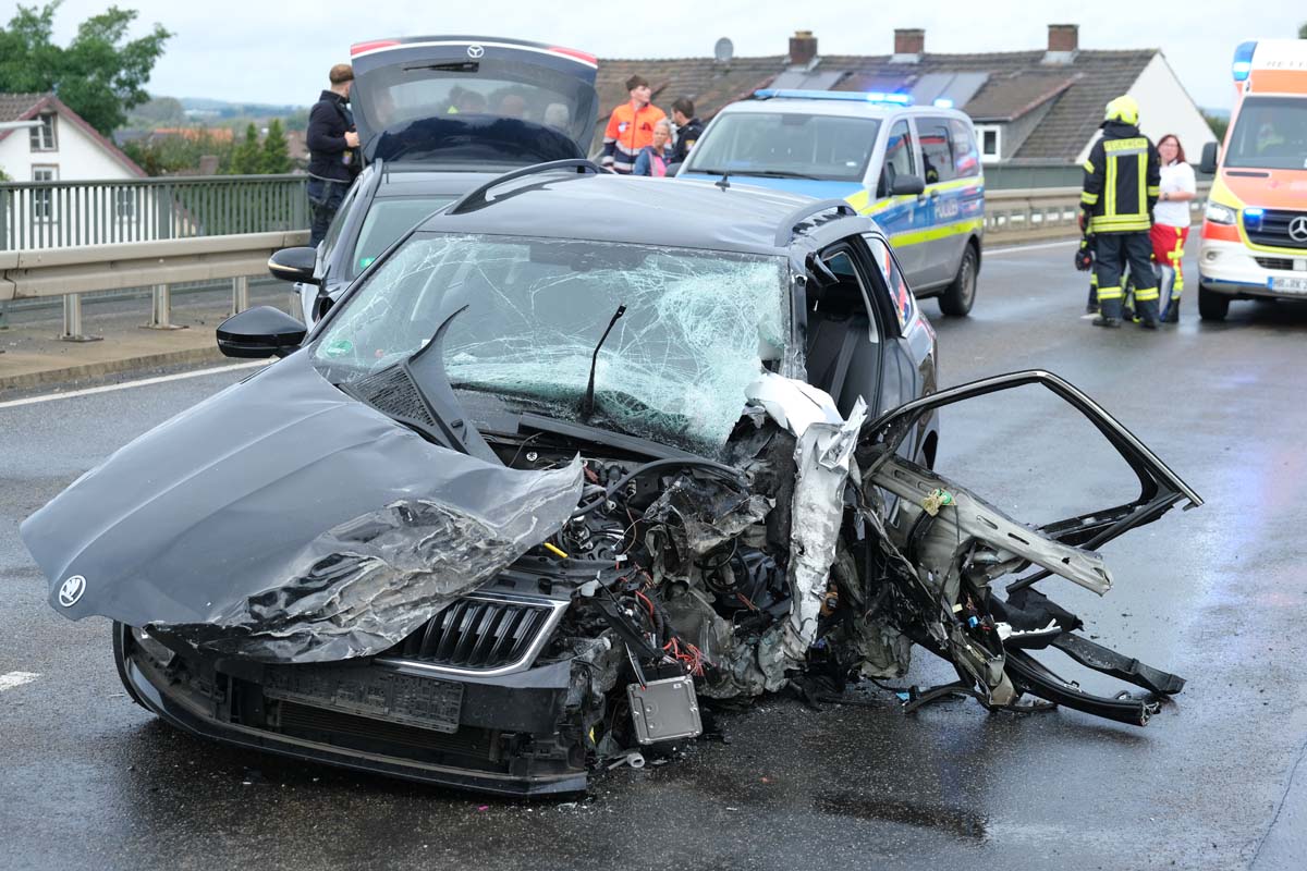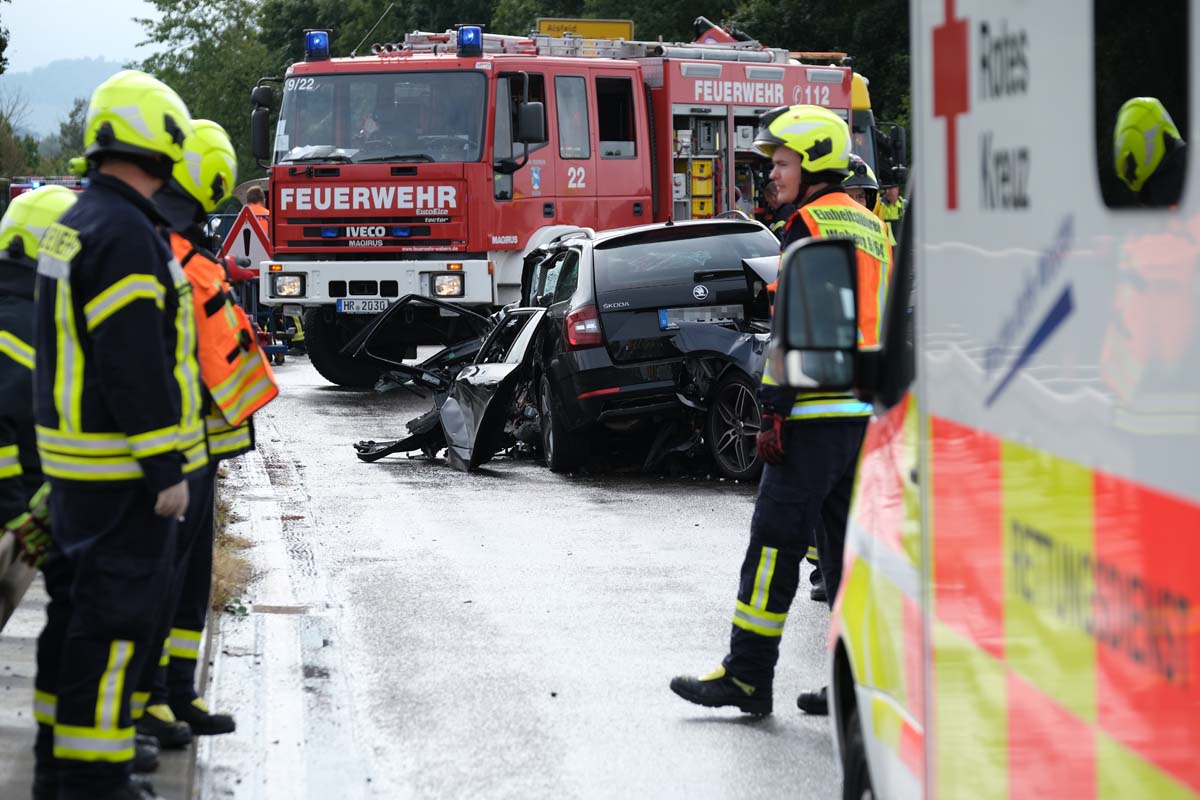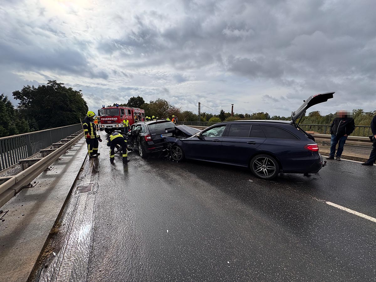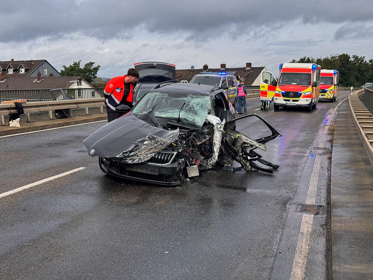 Ein 55-jähriger Skoda-Fahrer geriet gegen 10:30 Uhr auf der Brücke, die den Bahnhof in Wabern überführt, in den Gegenverkehr. Dabei streifte er zunächst den linken Außenspiegel eines Cupra, bevor er seitlich versetzt mit einem entgegenkommenden Jeep kollidierte. Durch den Zusammenstoß drehte sich der Skoda und blieb quer zur Fahrbahn stehen. Kurz darauf prallte ein Mercedes auf das Heck des Unfallfahrzeugs, da der Fahrer nicht mehr rechtzeitig bremsen konnte. Der 55-Jährige wurde bei dem Unfall im Bereich der unteren Extremitäten in seinem Fahrzeug eingeklemmt. Feuerwehrleute aus Wabern befreiten ihn mit hydraulischen Geräten. Anschließend wurde der Schwerverletzte im Rettungswagen versorgt, bevor die Crew des Rettungshubschraubers Christoph 44 aus Göttingen ihn in eine Kasseler Klinik flog. Die Ermittlungen zur Unfallursache laufen, und die Polizeistation Fritzlar hat den Unfall aufgenommen. Vor Ort waren mehrere Rettungsteams, ein Notarztteam, ein Helfer-vor-Ort-Team (HVO) der Malteser, zwei Streifenwagenbesatzungen sowie 30 Feuerwehrleute unter der Leitung von Dr. Jan-Christoph Zarges im Einsatz. Der Sachschaden wird auf etwa 80.000 Euro geschätzt. Der Skoda, der Jeep und der Mercedes erlitten wirtschaftliche Totalschäden. (wal)