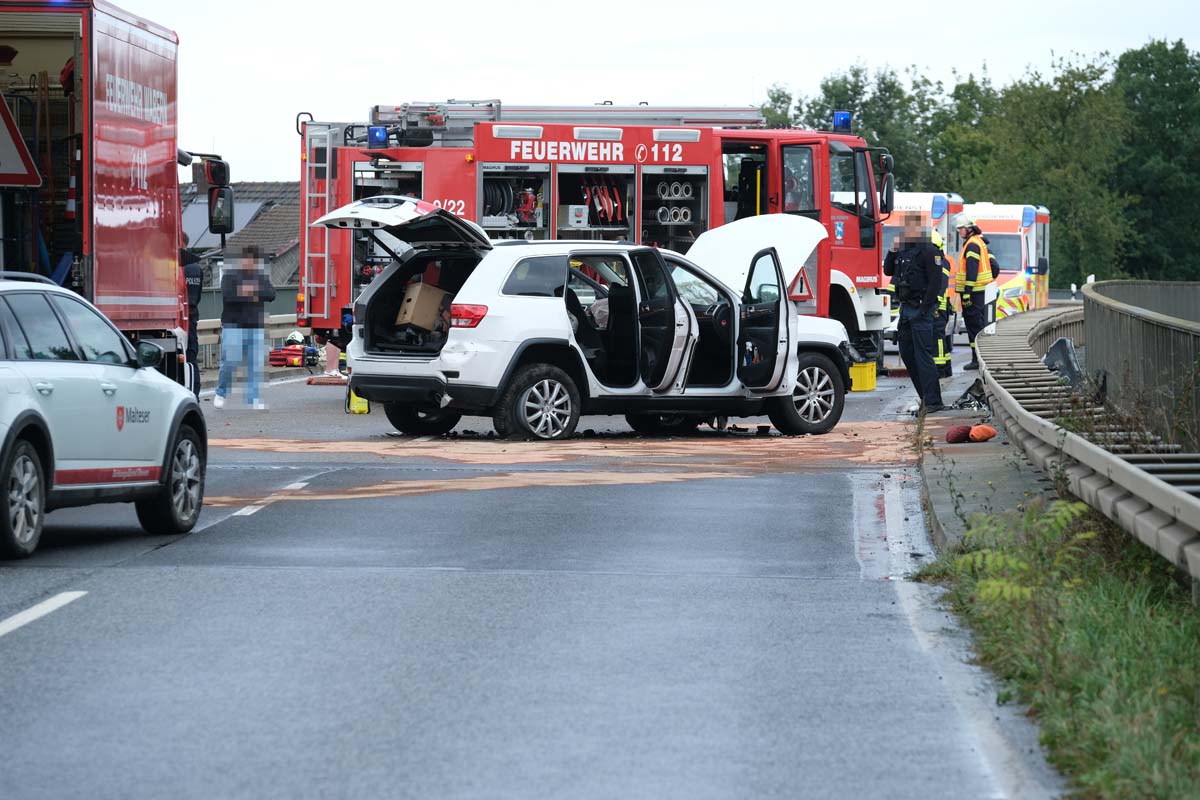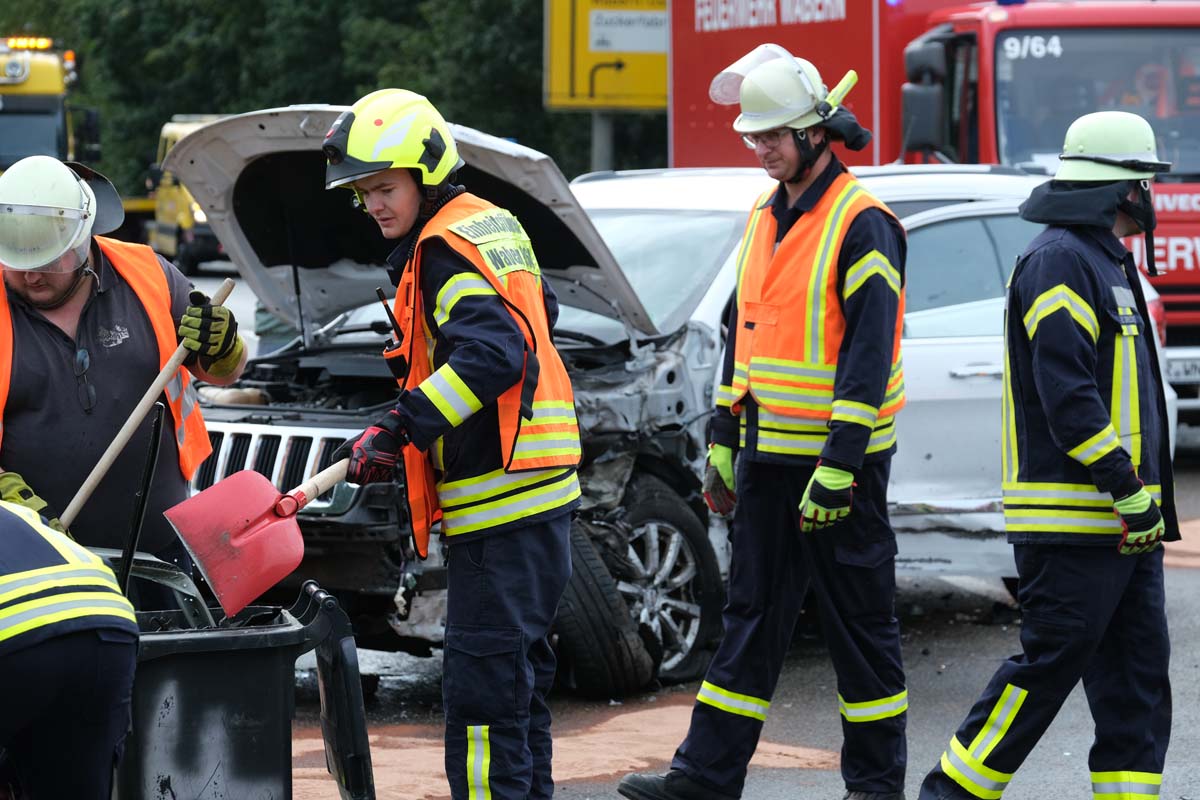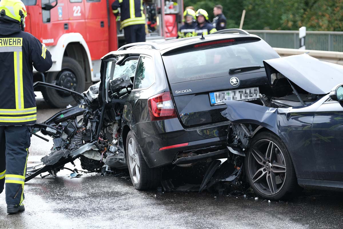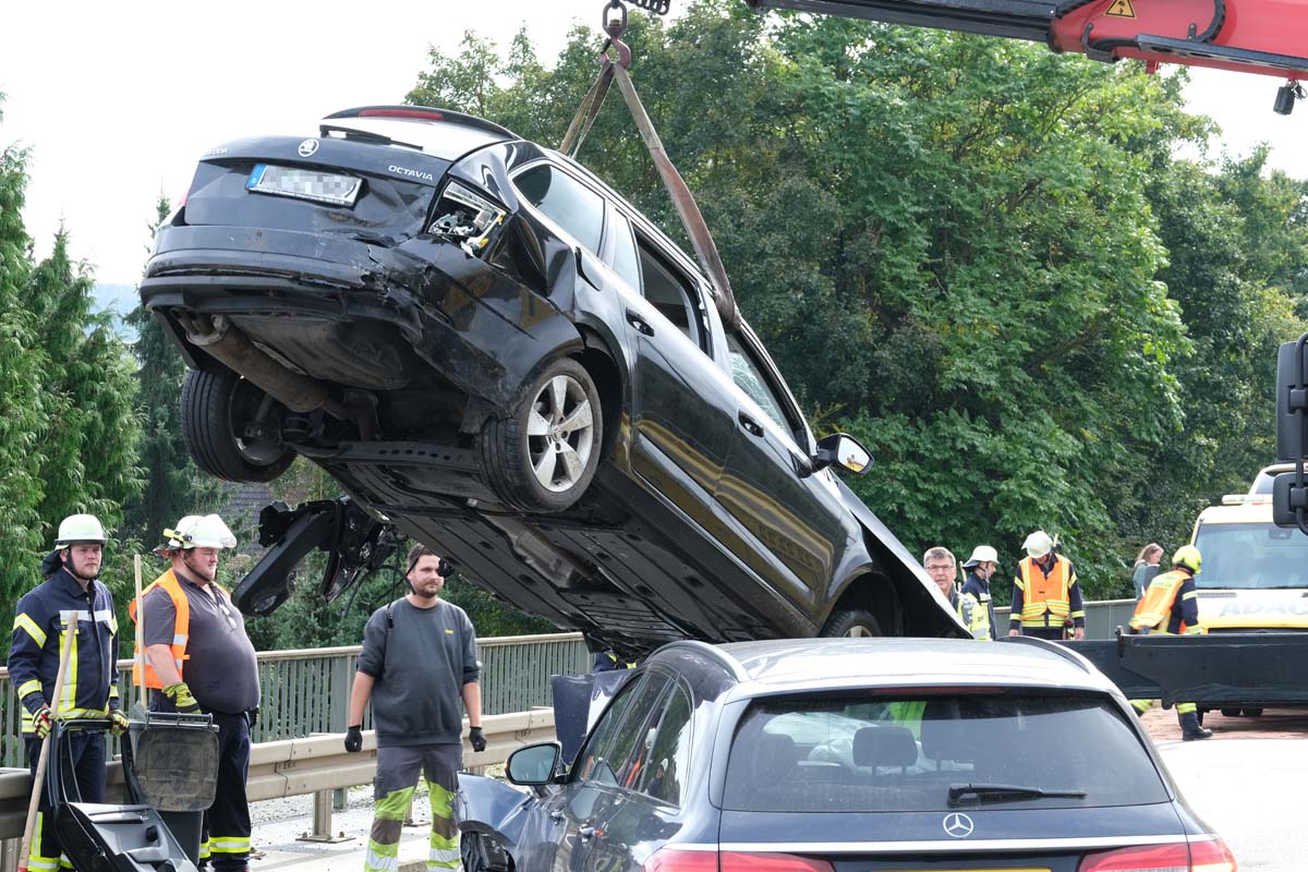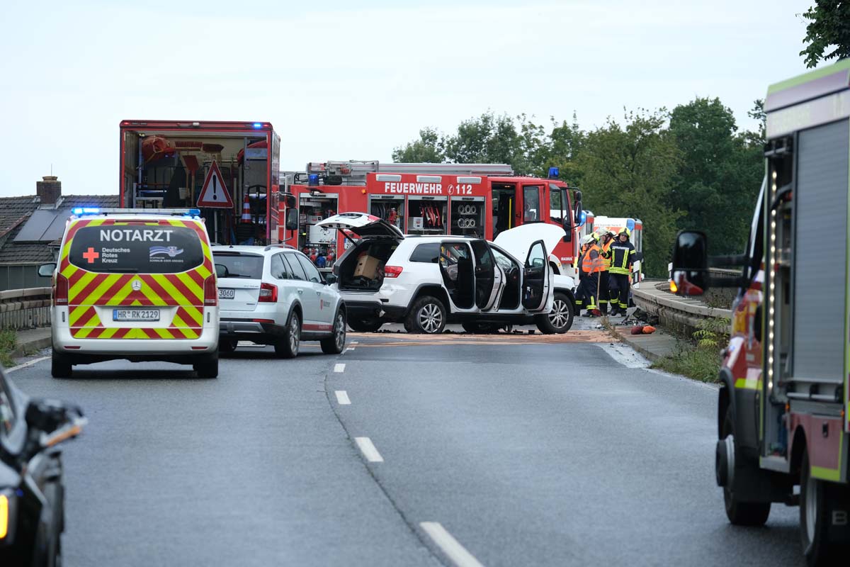 Ein 55-jähriger Skoda-Fahrer geriet gegen 10:30 Uhr auf der Brücke, die den Bahnhof in Wabern überführt, in den Gegenverkehr. Dabei streifte er zunächst den linken Außenspiegel eines Cupra, bevor er seitlich versetzt mit einem entgegenkommenden Jeep kollidierte. Durch den Zusammenstoß drehte sich der Skoda und blieb quer zur Fahrbahn stehen. Kurz darauf prallte ein Mercedes auf das Heck des Unfallfahrzeugs, da der Fahrer nicht mehr rechtzeitig bremsen konnte. Der 55-Jährige wurde bei dem Unfall im Bereich der unteren Extremitäten in seinem Fahrzeug eingeklemmt. Feuerwehrleute aus Wabern befreiten ihn mit hydraulischen Geräten. Anschließend wurde der Schwerverletzte im Rettungswagen versorgt, bevor die Crew des Rettungshubschraubers Christoph 44 aus Göttingen ihn in eine Kasseler Klinik flog. Die Ermittlungen zur Unfallursache laufen, und die Polizeistation Fritzlar hat den Unfall aufgenommen. Vor Ort waren mehrere Rettungsteams, ein Notarztteam, ein Helfer-vor-Ort-Team (HVO) der Malteser, zwei Streifenwagenbesatzungen sowie 30 Feuerwehrleute unter der Leitung von Dr. Jan-Christoph Zarges im Einsatz. Der Sachschaden wird auf etwa 80.000 Euro geschätzt. Der Skoda, der Jeep und der Mercedes erlitten wirtschaftliche Totalschäden. (wal)