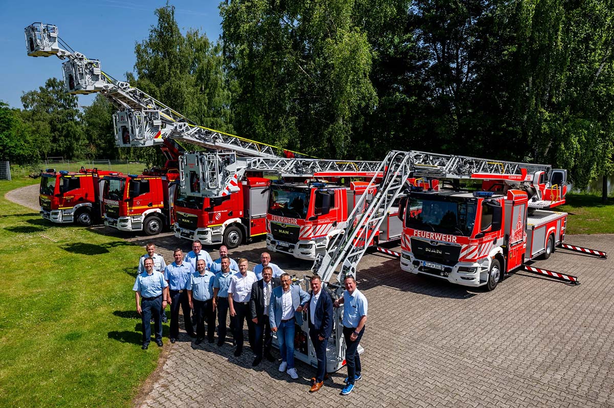 Neue Drehleitern für Feuerwehren Kassel, Baunatal, Vellmar und Felsberg: (v. li.) Markus Böse (Feuerwehr Kassel, Technik und Logistik), Thomas Schmidt (stellv. Leiter Feuerwehr Kassel), Michael Blossey (Wehrführer Feuerwehr Felsberg), Ralf Seitz (Stadtbrandinspektor Baunatal), Heiko Wicke (stellv. Stadtbrandinspektor Baunatal), Tobias Winter (Leiter Feuerwehr Kassel), Johannes Zelmer (stellv. Stadtbrandinspektor Vellmar). Hans‐Georg Trust (1. Stadtrat Vellmar), Dr. Björn Faupel (Bürgermeister Felsberg), Henry Richter (Bürgermeister Baunatal), Andreas Siebert (Landrat LK Kassel), Winfried Becker (Landrat Schwalm‐Eder), Heiko Lehmkuhl (Brandschutzdezernent Stadt Kassel).