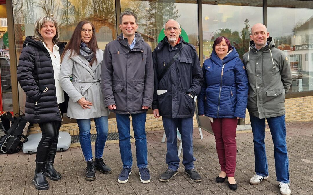 PTA Larissa Schrull, PKA Melanie Marx (Herz-Apotheke Frielendorf), Apotheker Timo Henkel (Stern-Apotheke Homberg Efze), Kreistagabgeordneter Hans-Joachim Böhme-Gingold (Die Linke), Apothekerin Michaela Mann (Eder-Apotheke Grifte / Delegierte der Apothekerkammer Hessen), Apotheker Nils-Steffen Grönig (Edder-Apotheke Gensungen) vor der Stern-Apotheke in Homberg (Efze) (wal)