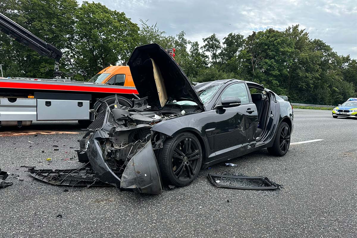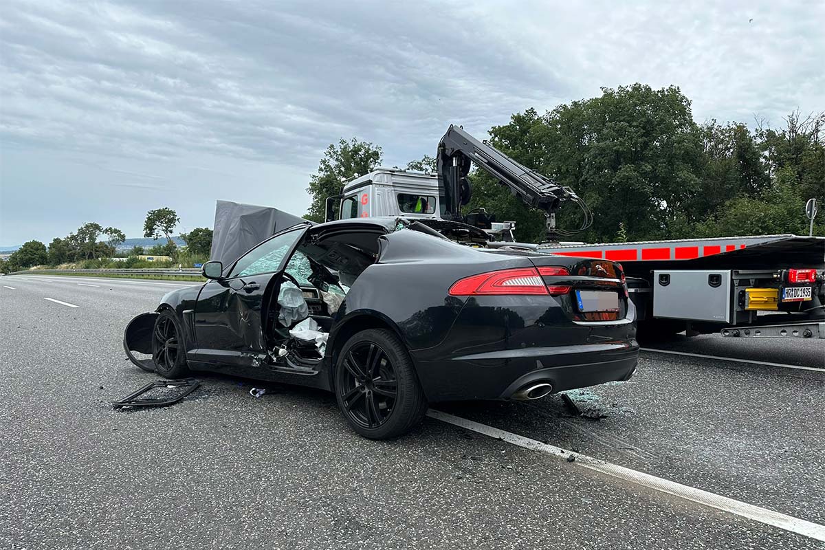 Am heutigen Vormittag kam es gegen 10:45 Uhr auf der Autobahn 7 in Fahrtrichtung Kassel zu einem Verkehrsunfall mit vier verletzten Personen. Nach Zeugenaussagen wechselte der Fahrer eines Opel vor dem 27-jährigen Jaguar-Fahrer den Fahrstreifen. Dabei kollidierten die beiden Fahrzeuge. Anschließend fuhr der Jaguar auf das Heck eines Sattelzuges auf, der verkehrsbedingt bis zum Stillstand abbremsen musste, wie die Polizeiautobahnstation Baunatal berichtet.