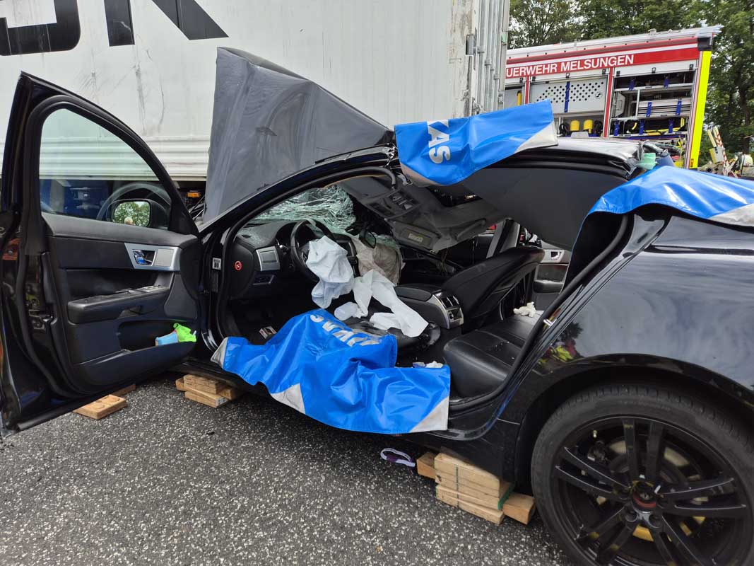Bei dem Aufprall erlitt die 30-jährige Beifahrerin im Jaguar schwere, aber nicht lebensbedrohliche Verletzungen. Sie musste von der Feuerwehr Melsungen aus dem Fahrzeugwrack befreit und mit einem Rettungshubschrauber in ein Krankenhaus gebracht werden. Der Jaguar-Fahrer wurde leicht verletzt und ebenfalls in ein Krankenhaus eingeliefert.