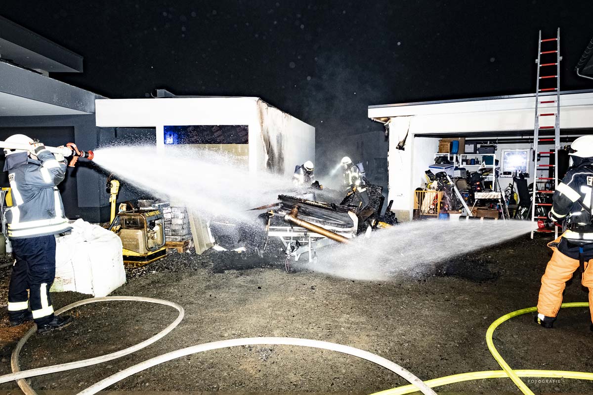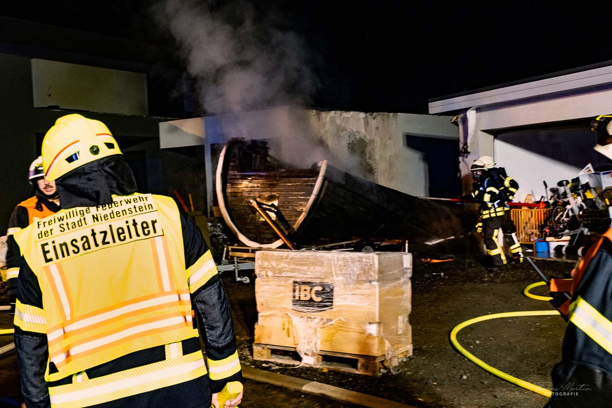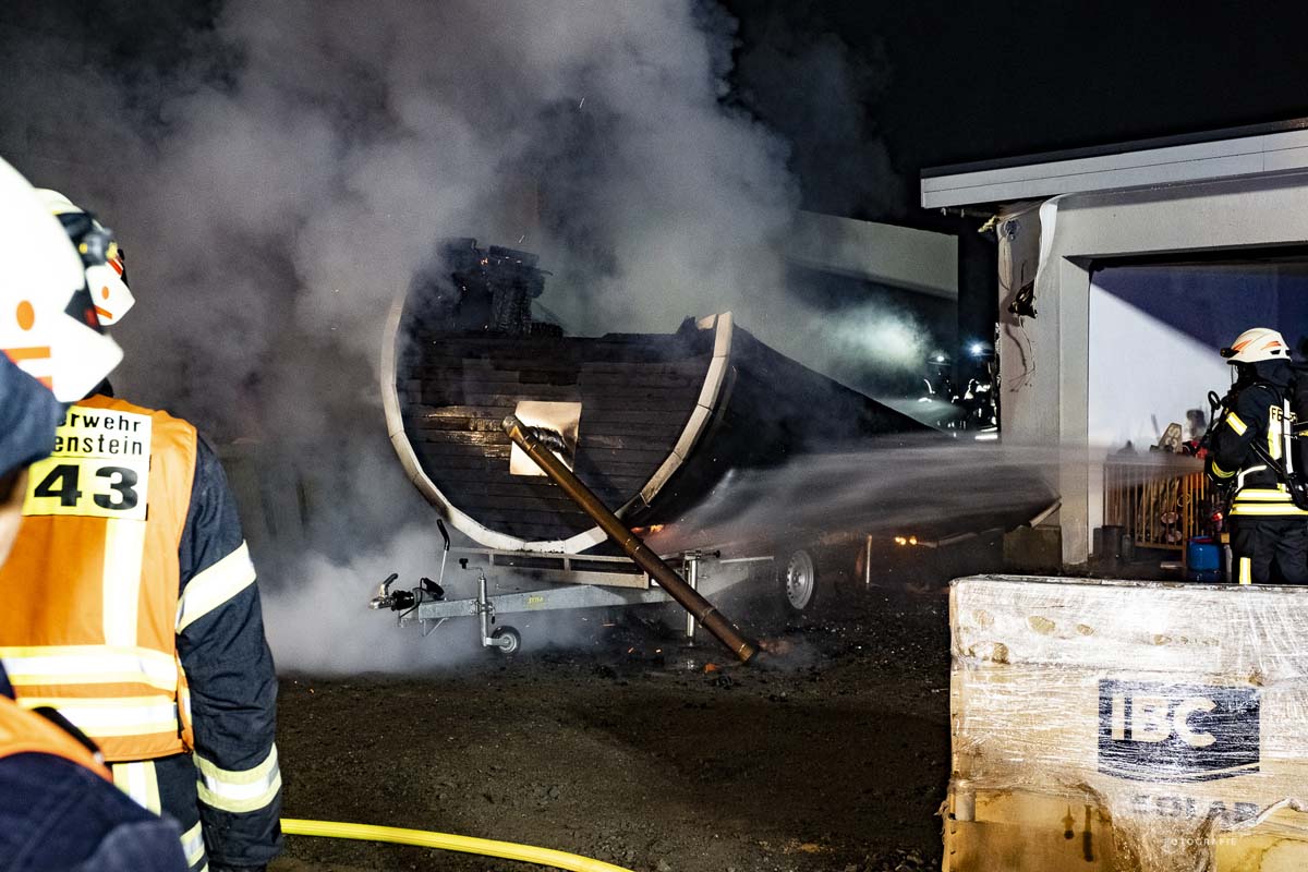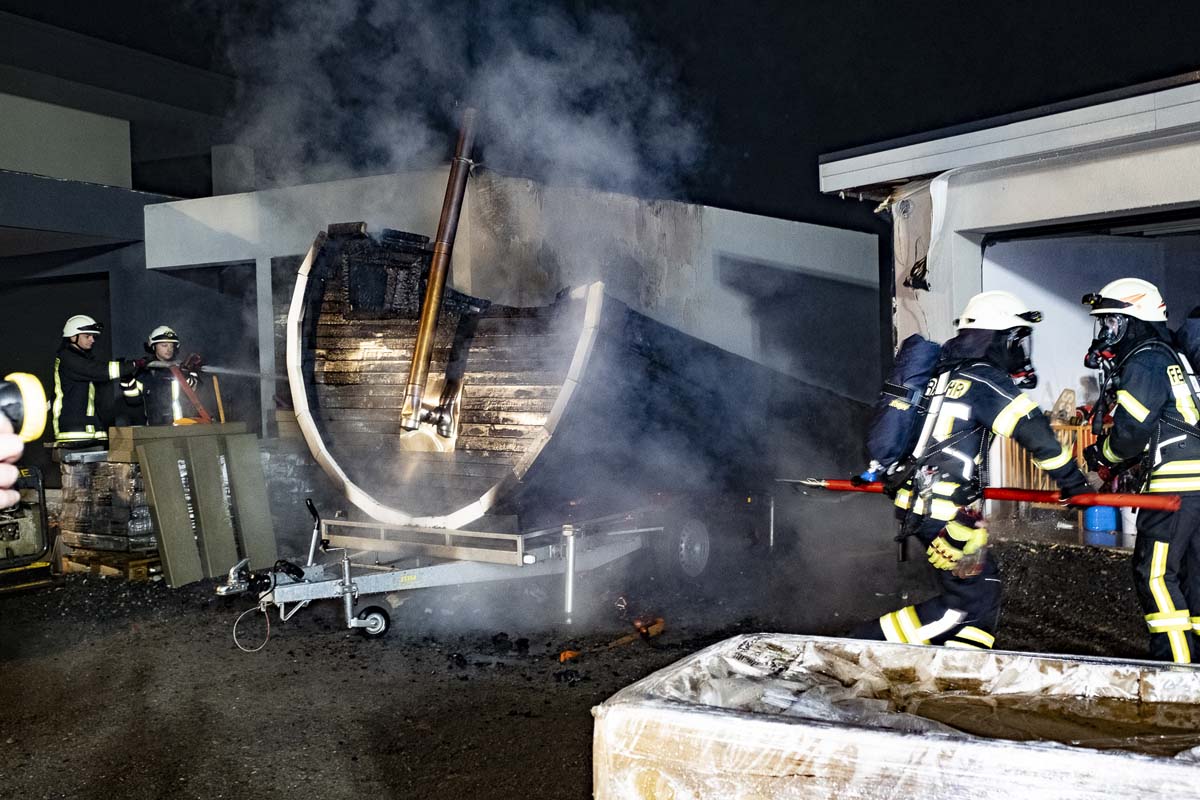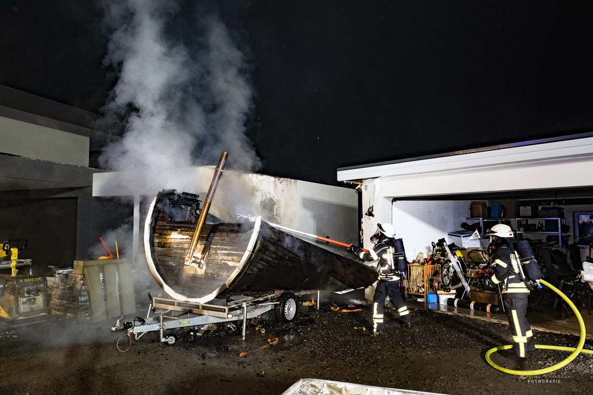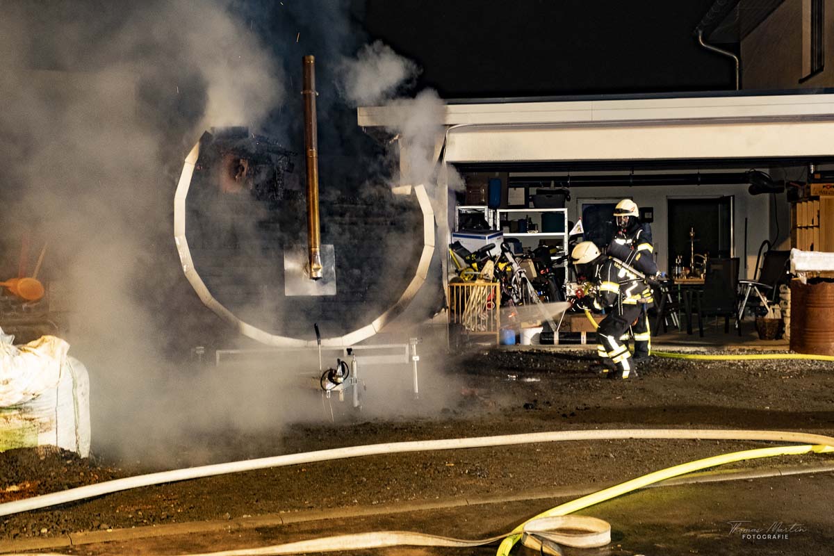WICHDORF. In Niedenstein-Wichdorf brannte am frühen Samstagmorgen eine mobile Sauna, die auf dem Gelände eines privaten Grundstücks stand und am Freitagabend in Betrieb war. Eine Zeugin bemerkte den Brand und alarmierte die Feuerwehr. Durch die Flammen der brennenden Sauna wurde auch eine Garage in Mitleidenschaft gezogen. Der Sachschaden liegt nach einer ersten Schätzung der Polizei bei rund 15.000 EUR. Die Ermittlungen zur Brandursache dauern an. Wie Thomas Martin von der Feuerwehr berichtet, erfordert der Brand mehrere Atemschutztrupps. Das benötigte Wasser kam zunächst aus den Tanks der Löschfahrzeuge, anschließend aus Hydranten. Die Reste der Sauna mussten mit Einreißhaken auseinander gezogen. Der Brandschutt konnte dann mit einer Wärmebildkamera auf Brandnester kontrolliert und abgelöscht werden. Zudem kontrollierten Feuerwehrleute die angrenzenden Gebäude, um einen Branddurchschlag auszuschließen. Der Einsatz wurde von Stadtbrandinspektor Jan Hohmann geleitet. Im Einsatz waren die Feuerwehren Niedenstein+Wichdorf mit 35 Frauen und Männern, ein Rettungsteam der Malteser aus Gudensberg sowie eine Streifenwagenbesatzung der Polizeistation Fritzlar. (wal)