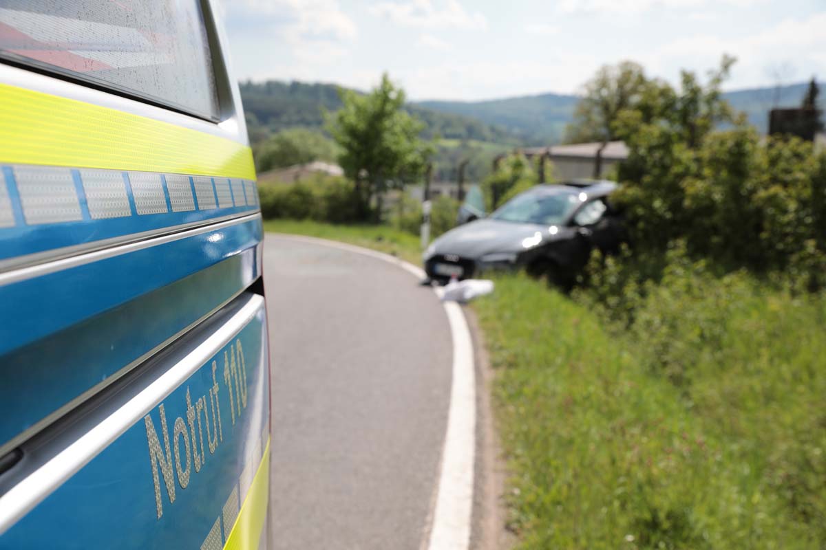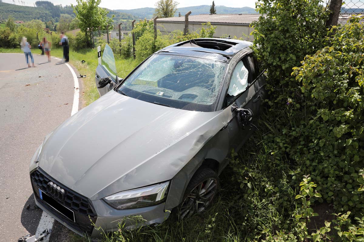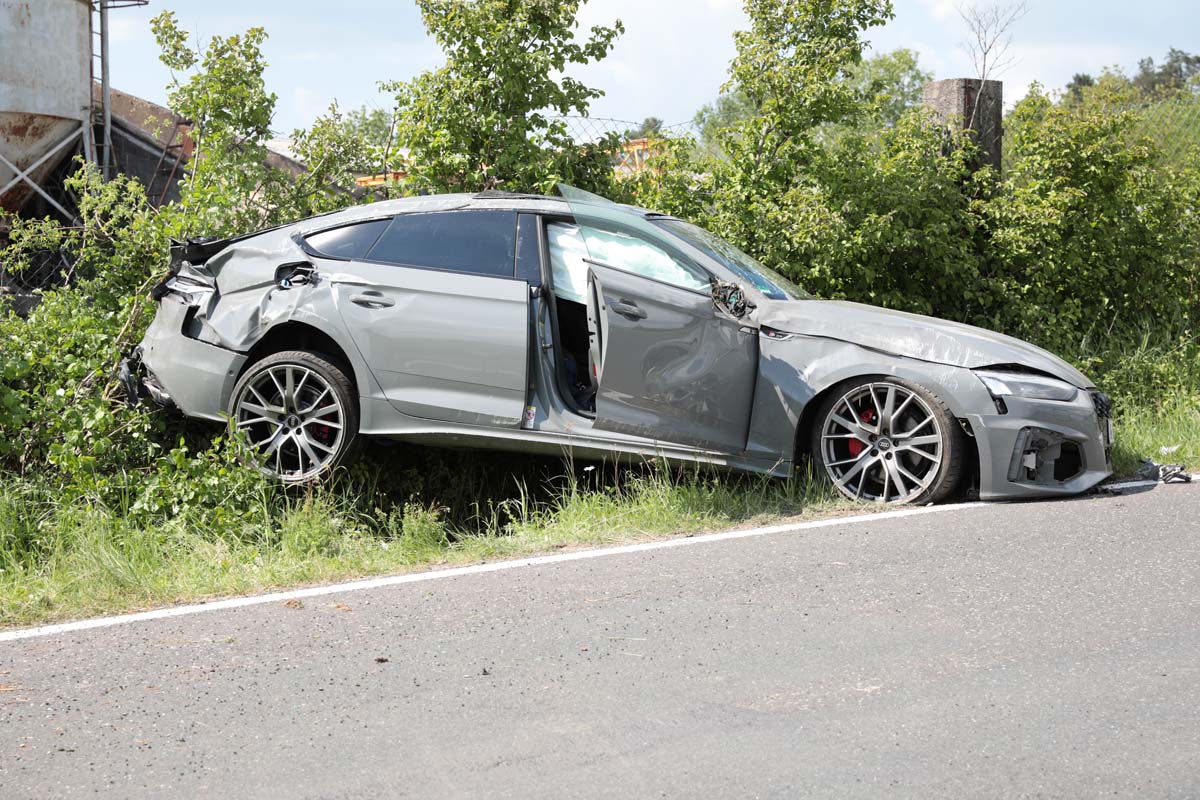 OBERAULA. Offenbar mit viel zu hoher Geschwindigkeit war am Montag gegen 14 Uhr ein Audi von Oberaula in Richtung des Eisenbergs unterwegs. Der mutmaßlich ortsunkundige Fahrer überholte Zeugenaussagen zufolge in der kurvigen Strecke zwei vor ihm fahrende Fahrzeuge. Beim Wiedereinscheren in einer Linkskurve geriet er im Steigungsbereich der Verlängerung der Homberger Straße nach rechts von der Fahrbahn ab und schlug mit der Front des Fahrzeugs heftig im Erdwall des Flutgrabens ein. Das Auto überschlug sich dann mehrfach und überquerte die Fahrbahn. Der Audi kam in Höhe eines eingezäunten Grundstücks auf den Rädern stehend zum Stillstand. Der Fahrer des Audi (24) und sein Beifahrer erlitten eher leichte Verletzungen, wie Schürfwunden und Prellungen. Rettungskräfte brachten beide in das Asklepios-Klinikum Schwalmstadt. Die Strecke war während des Rettungsdiensteinsatzes voll gesperrt, was aufgrund der hohen Verkehrsbelastung zu einem erheblichen Stau in Oberaula führte. An dem Auto entstand wirtschaftlicher Totalschaden. Weitere Fahrzeuge waren nicht an dem Unfall beteiligt.