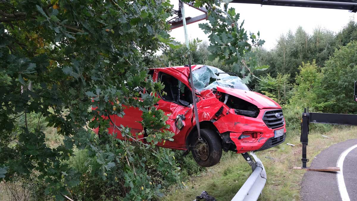 Am Donnerstagmorgen, kurz nach 6 Uhr, wurde eine 64-jährige Frau auf der Landesstraße 3224 zwischen der Homberger Kernstadt und Lengemannsau schwer verletzt. Ihr Ford Transit kam in einer scharfen S-Kurve hinter dem Basaltwerk von der Fahrbahn ab, durchbrach die Leitplanke, rutschte eine Böschung hinunter und prallte gegen einen Baum.