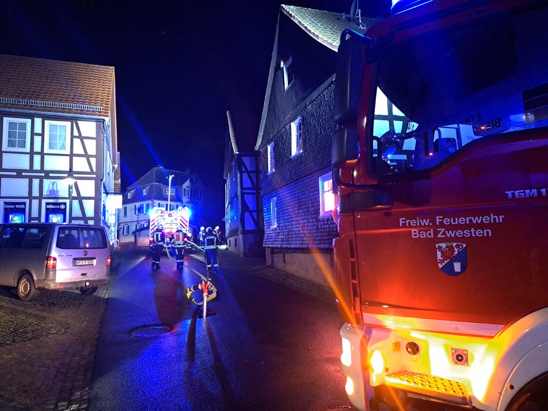 Als die Rettungskräfte eintrafen, befand sich niemand mehr im Gebäude. Das offene Feuer wurde vom Einsatztrupp schnell lokalisiert und erfolgreich gelöscht. Beide Bewohner wurden vom Rettungsdienst versorgt und ins Krankenhaus gebracht. Die Einsatzkräfte der Bad Zwestener Feuerwehren erhielten Unterstützung von der Feuerwehr Jesberg (insgesamt 53 Leute), drei Rettungsteams, einem Notarztteam sowie der Polizei Fritzlar. Auch Bürgermeister Achim Siebert von Bad Zwesten war vor Ort. Die Einsatzleitung oblag Marc Bachmann, dem Wehrführer der Kerngemeinde.