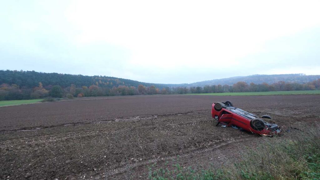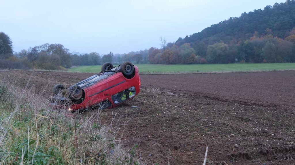 Glück im Unglück hatte am Dienstagmorgen ein 28-jähriger Autofahrer aus Neuental. Gegen 7:35 Uhr verlor er zwischen den Ortsteilen Schlierbach und Waltersbrück in einer Linkskurve die Kontrolle über sein Auto, kam nach rechts von der Fahrbahn ab und überschlug sich. Der Wagen blieb auf einem Acker auf dem Dach liegen.